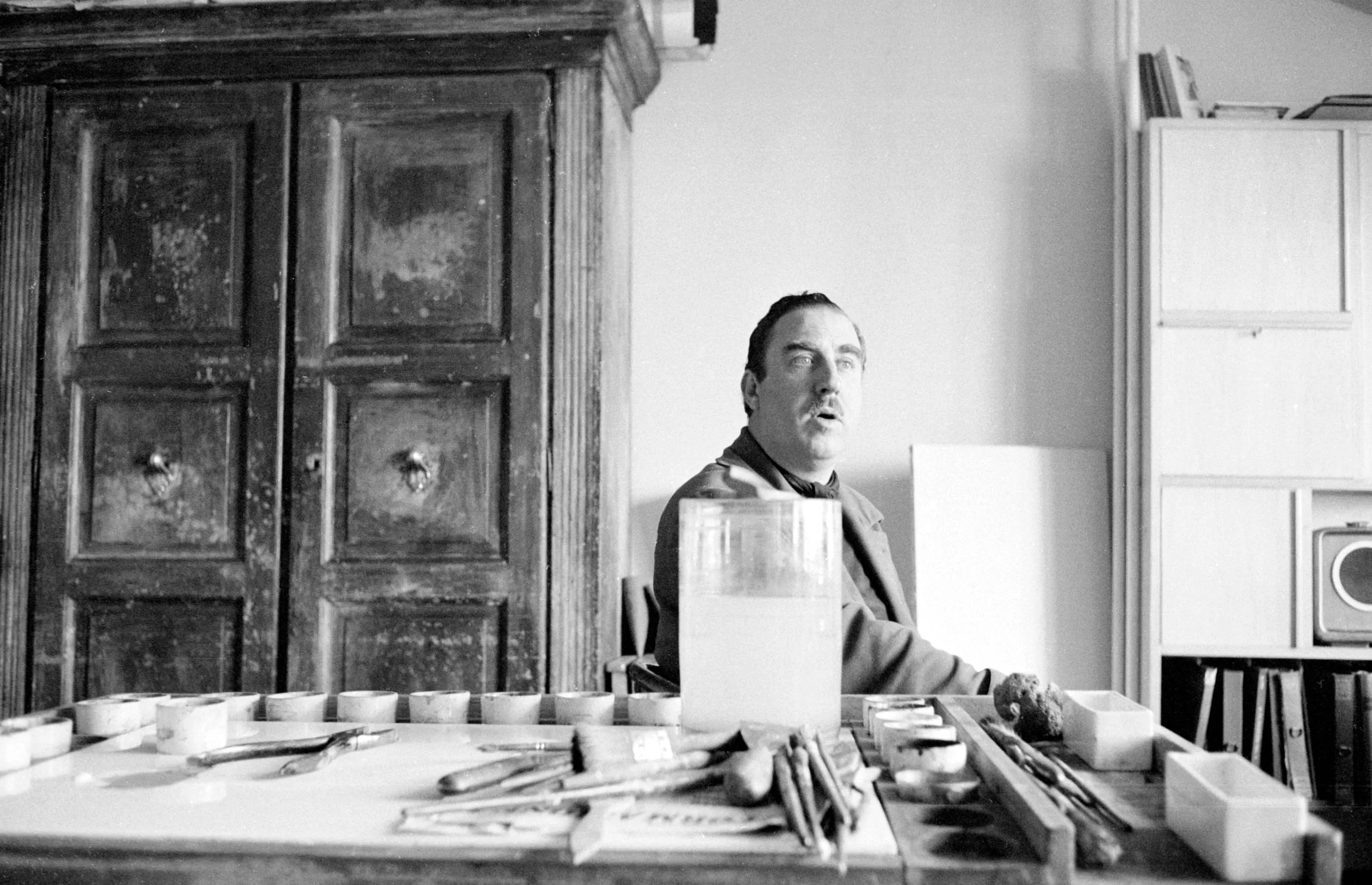 Black and white photograph of a man with a thin mustache seated behind a worktable spread with artist's brushes, palettes, and tools, a large glass jar in front of him, a dark wooden cabinet to his left