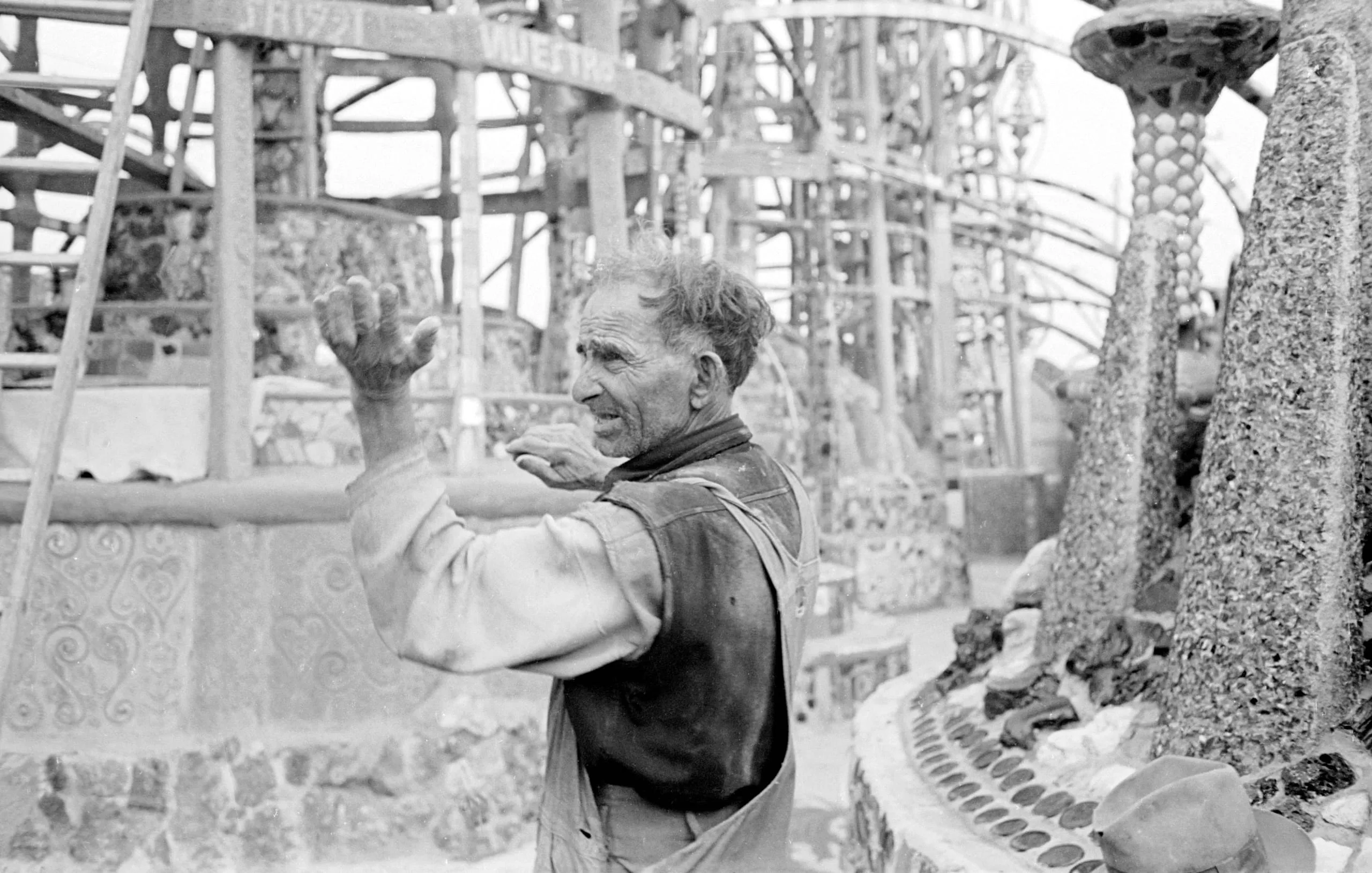 Black and white photograph of an older man in work clothes gesturing with one hand, surrounded by tall mosaic-encrusted towers and columns