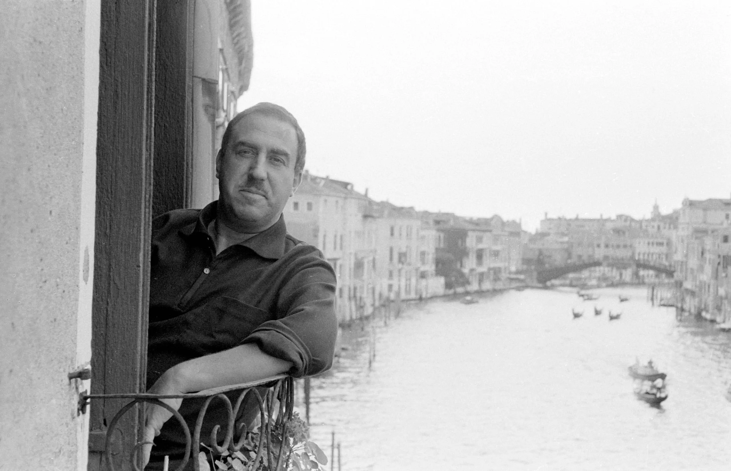 Black and white photograph of a man leaning on a wrought iron balcony railing, looking at the camera, with a Venetian canal and buildings receding into the distance behind him