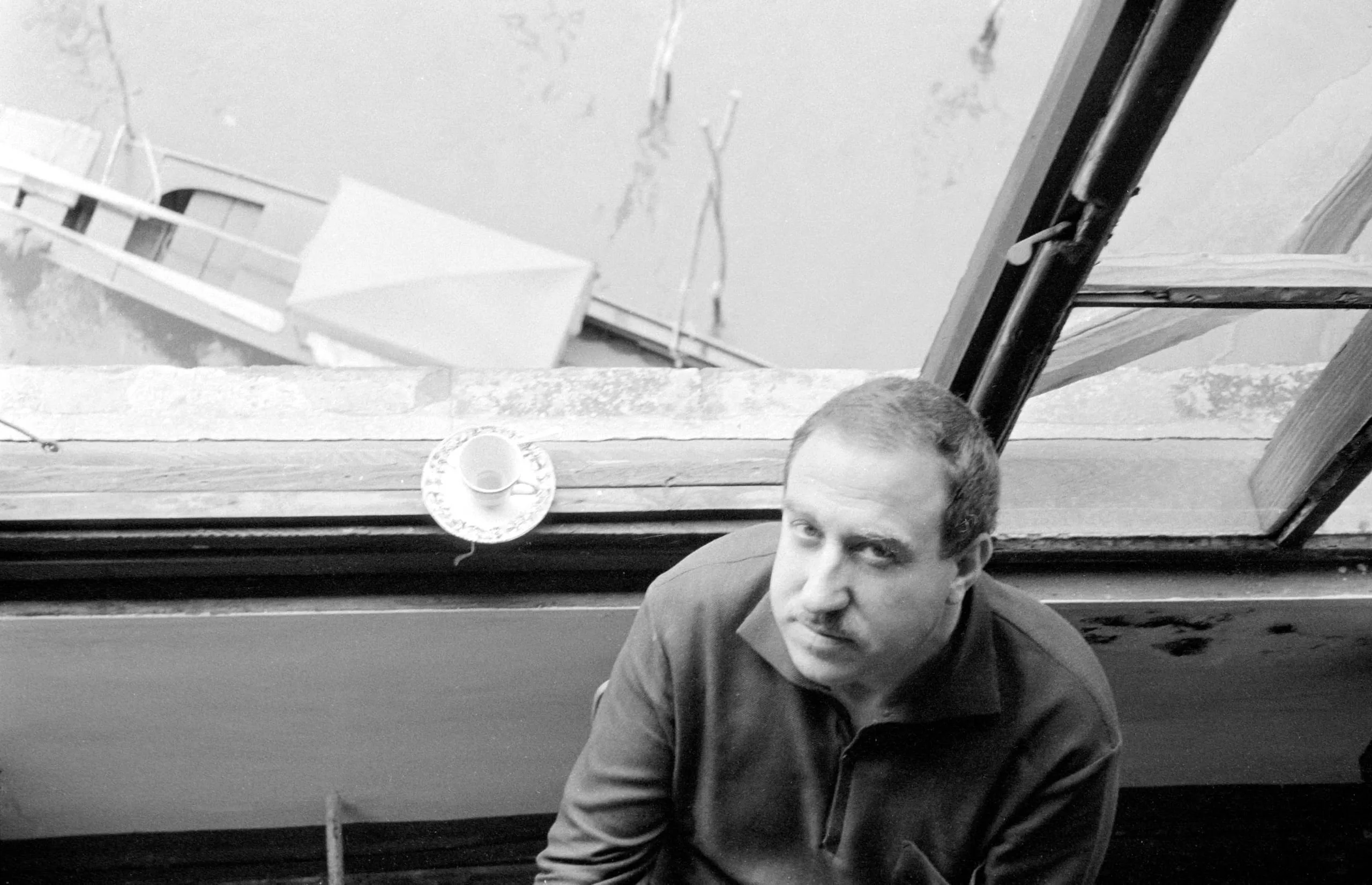 Black and white photograph of a man with a mustache seated near an open window overlooking a canal with moored boats, a coffee cup on the sill beside him