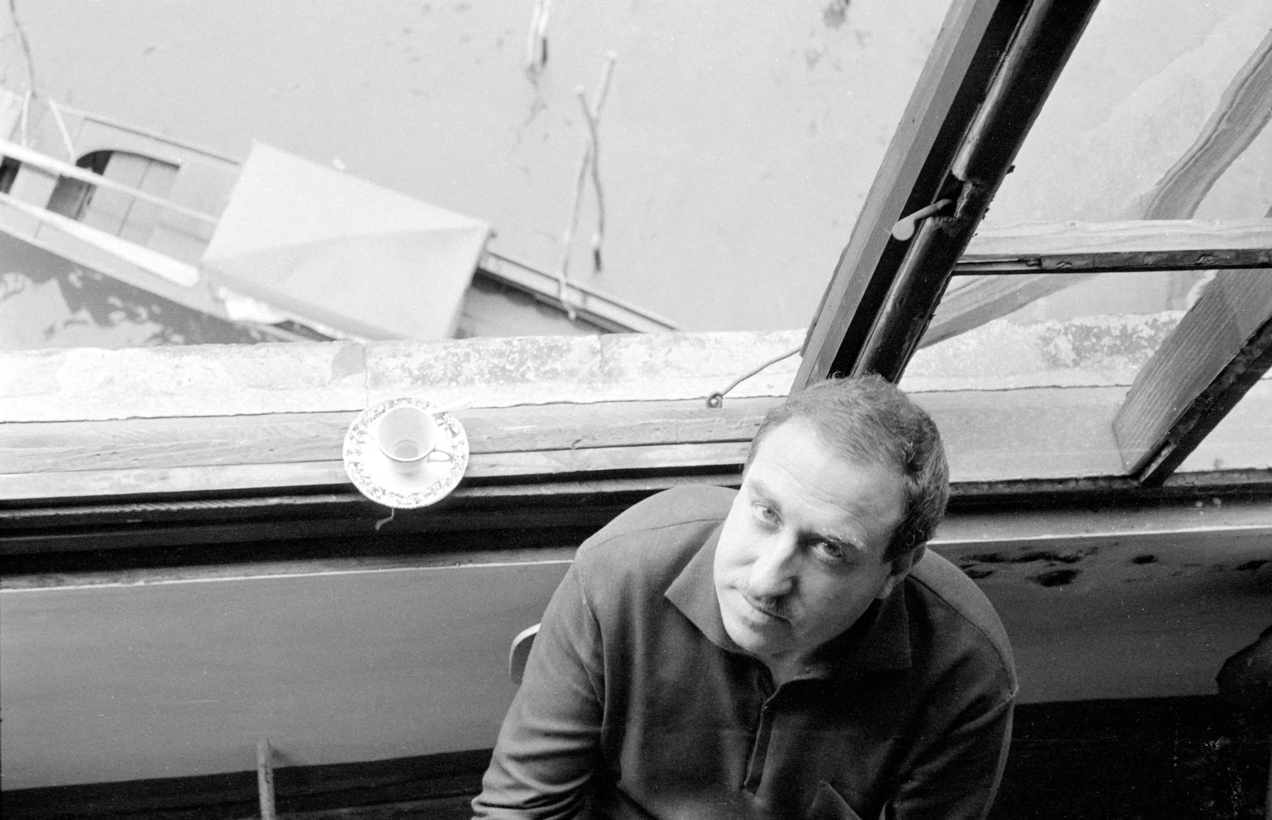 Black and white photograph, a white man seated indoors below an open window overlooking a harbor with a moored boat, looking upward and to the left