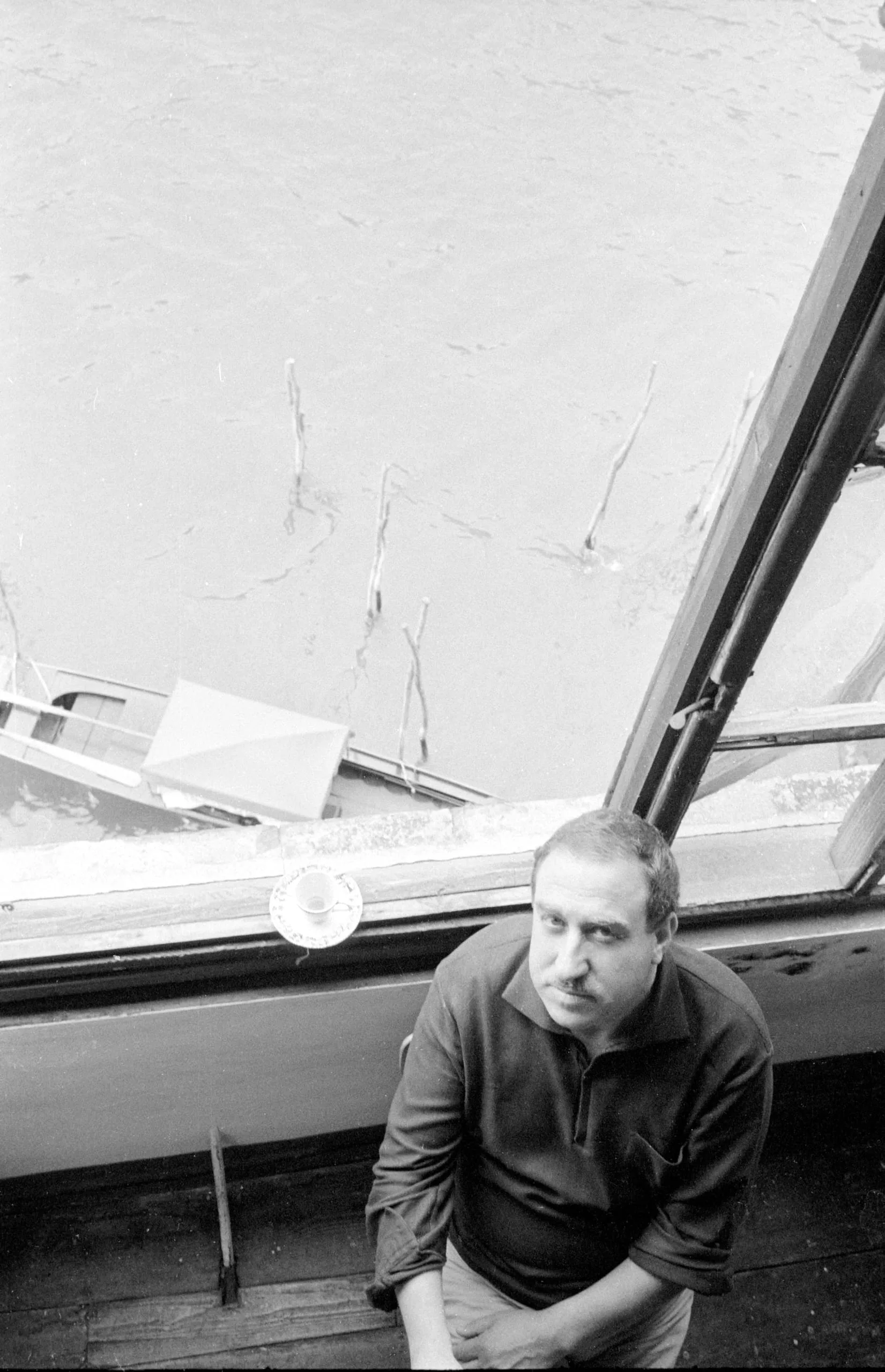 Black and white photograph looking down at a dark-haired man in a long-sleeved shirt seated on a wooden floor before a large angled skylight overlooking flooded water below