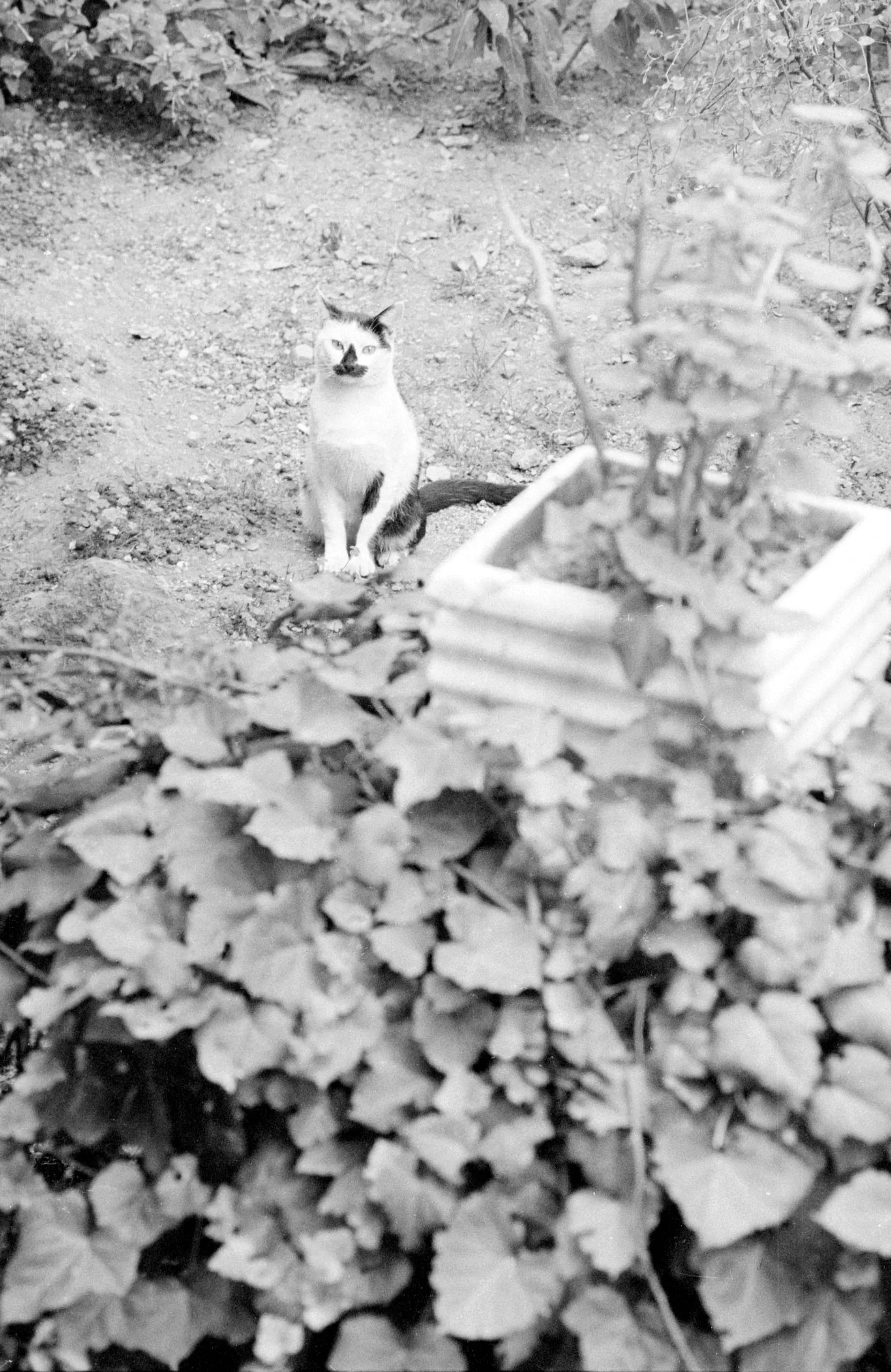 Black and white photograph looking down into a garden, a white cat with dark markings sitting on bare soil, looking up at the camera, surrounded by leafy plants and a small planter box