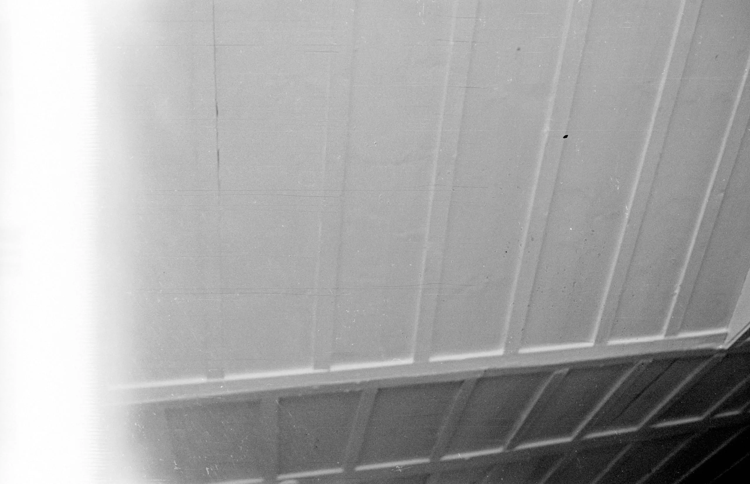 Black and white photograph looking upward at a painted wooden ceiling with vertical planks and recessed rectangular panels along the lower edge, with heavy light bleed along the left side