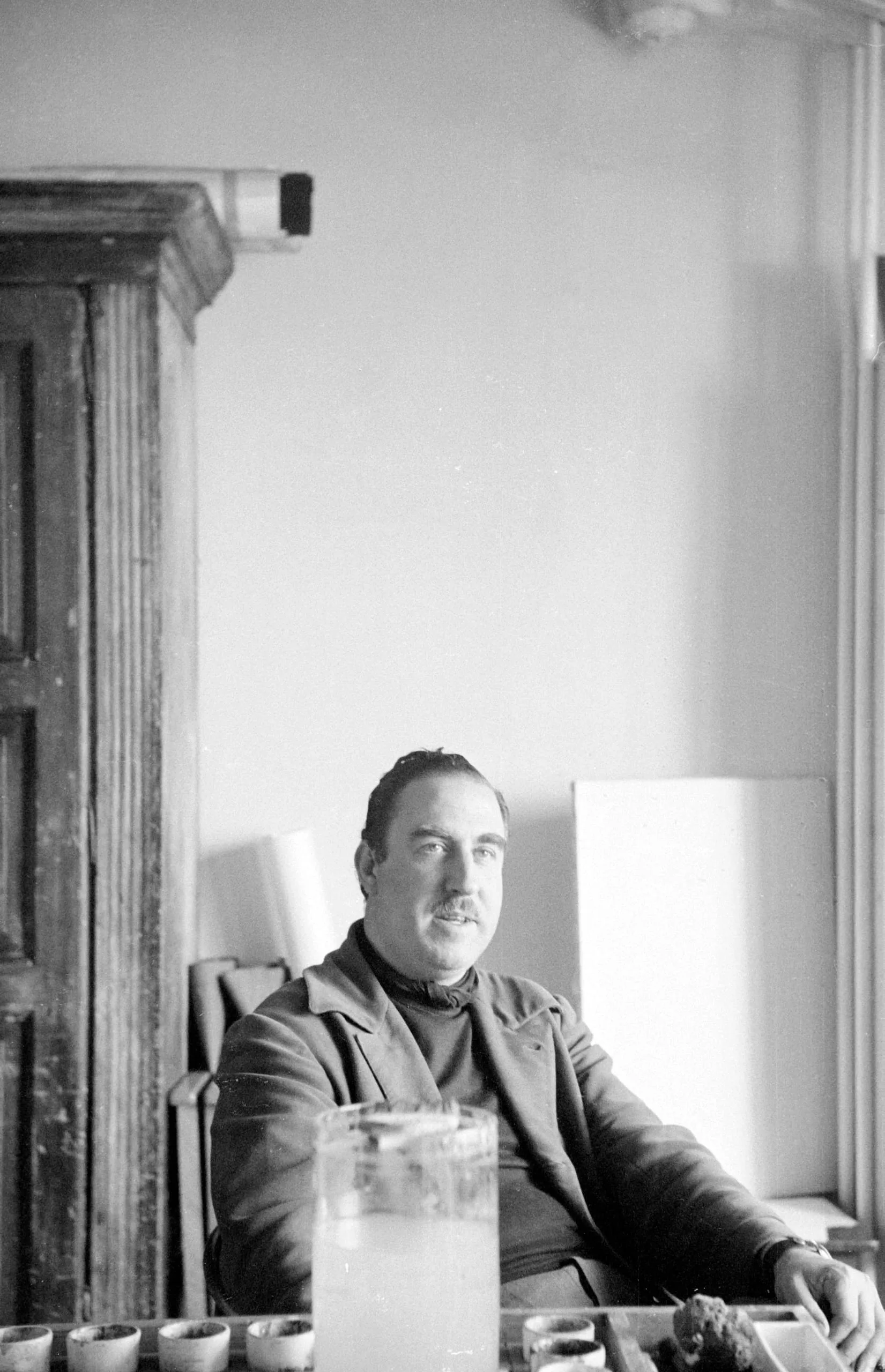 Black and white photograph, waist-up portrait of a seated man in a dark jacket looking directly at camera, soft diffused lighting
