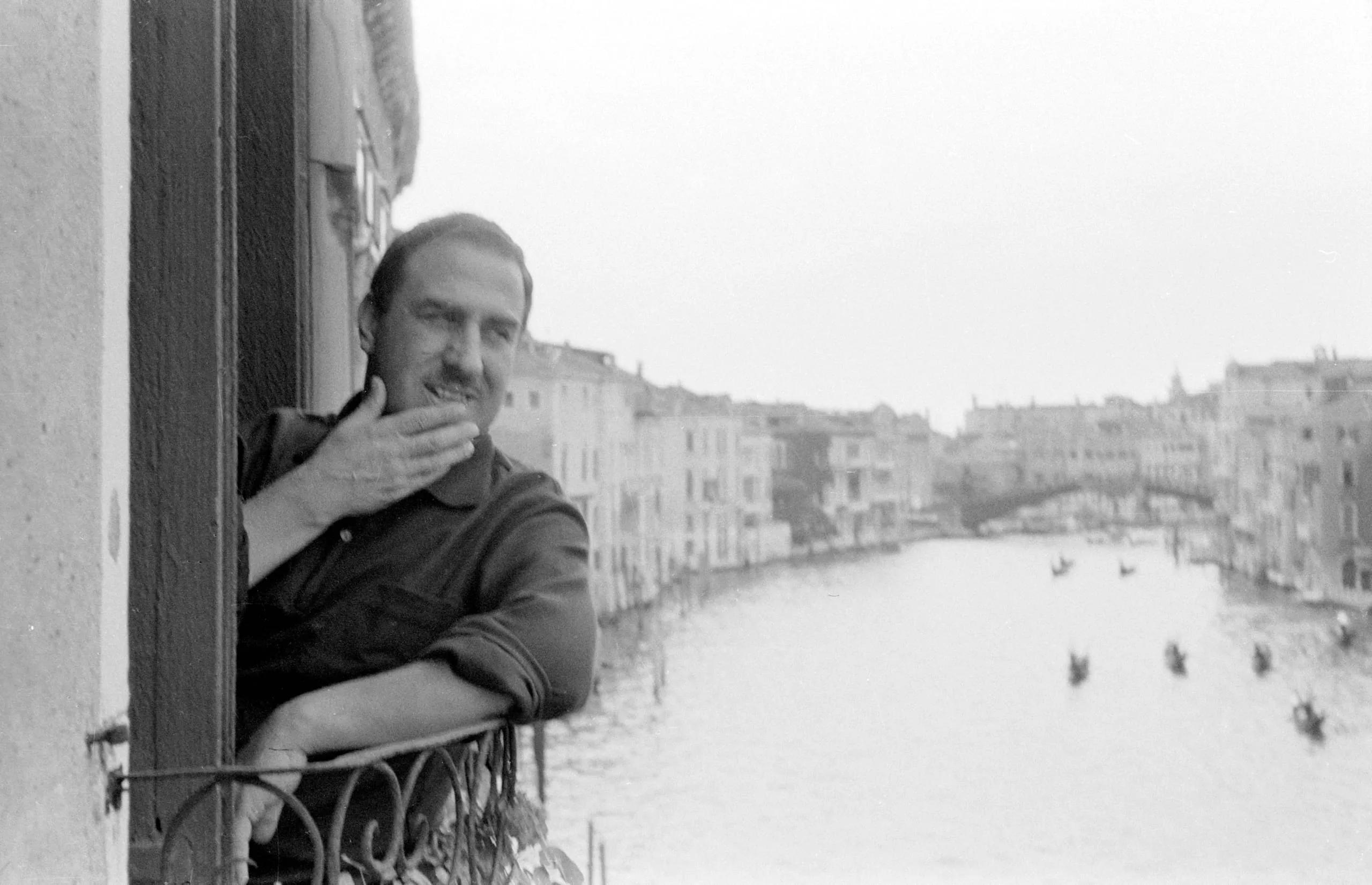 Black and white photograph of a dark-haired man with a goatee leaning on a wrought-iron balcony railing overlooking a Venetian canal