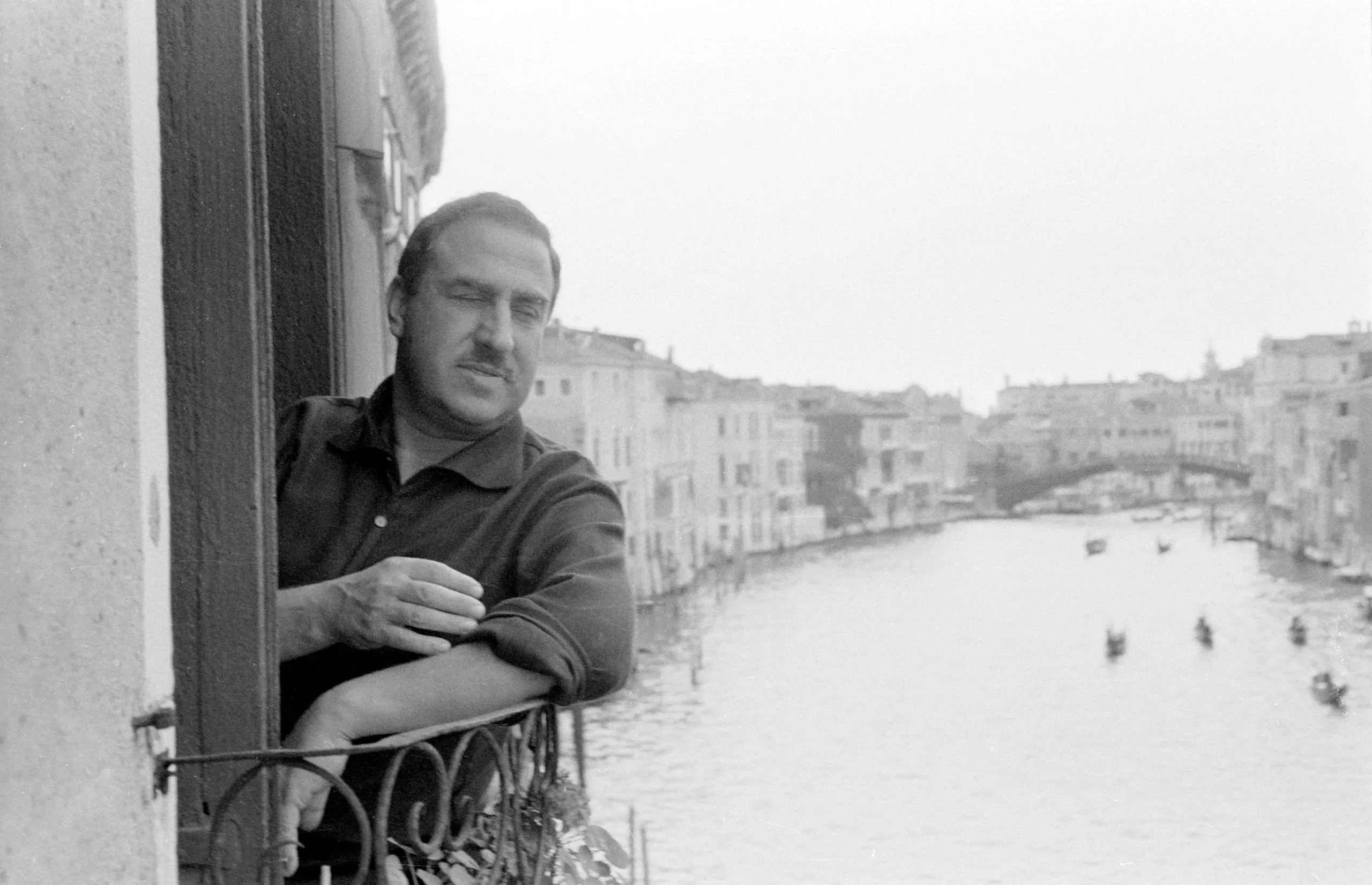 Black and white photograph, a man with a dark mustache leans on a wrought-iron balcony railing, a Venetian canal with gondolas and buildings receding into the distance behind him
