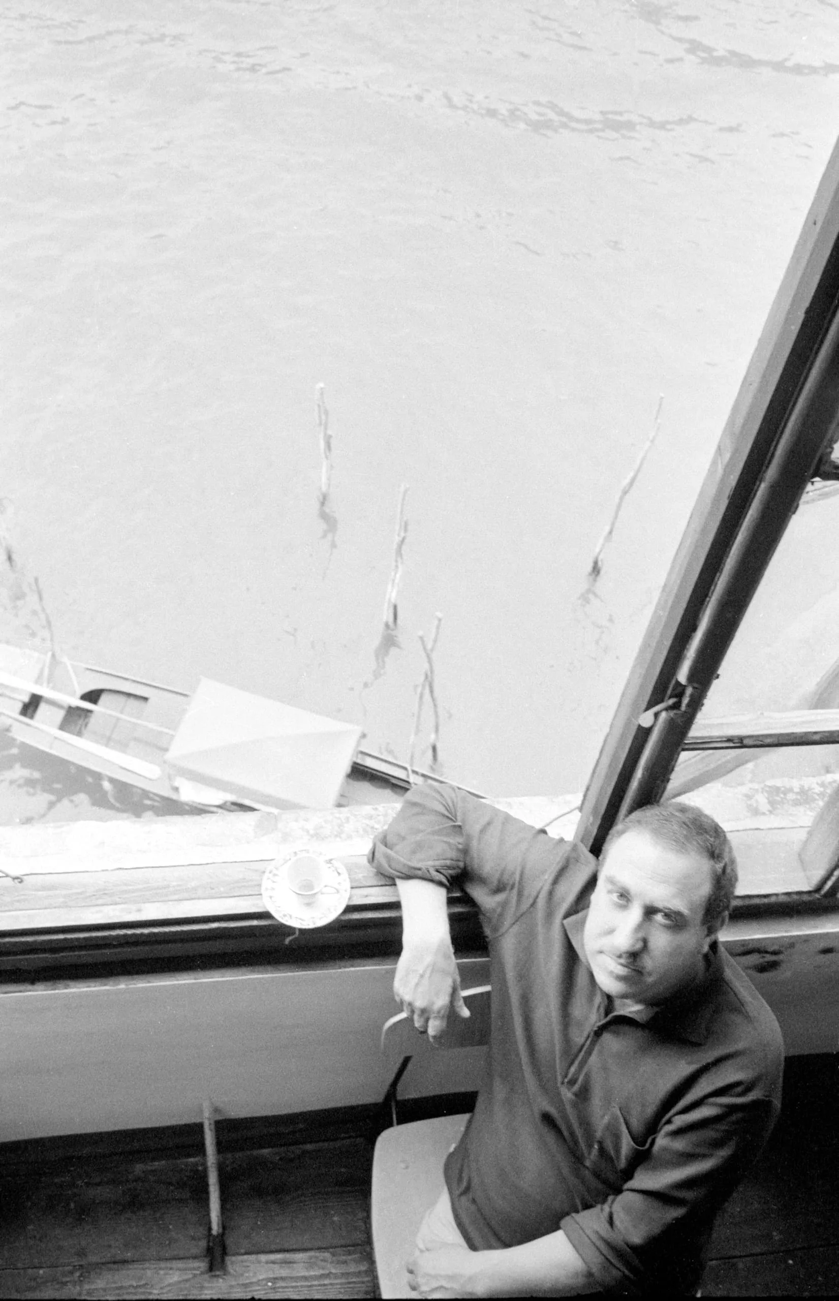Black and white photograph looking steeply down at a man seated inside a boat cabin, arm resting on a window ledge, water visible outside