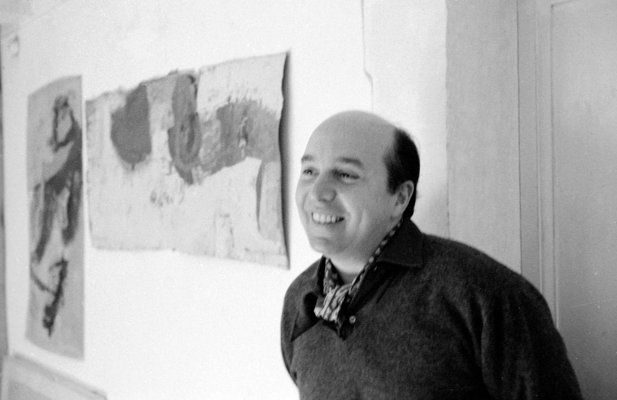 Black and white photograph of a smiling white man in a dark sweater standing before a white wall hung with two abstract paintings