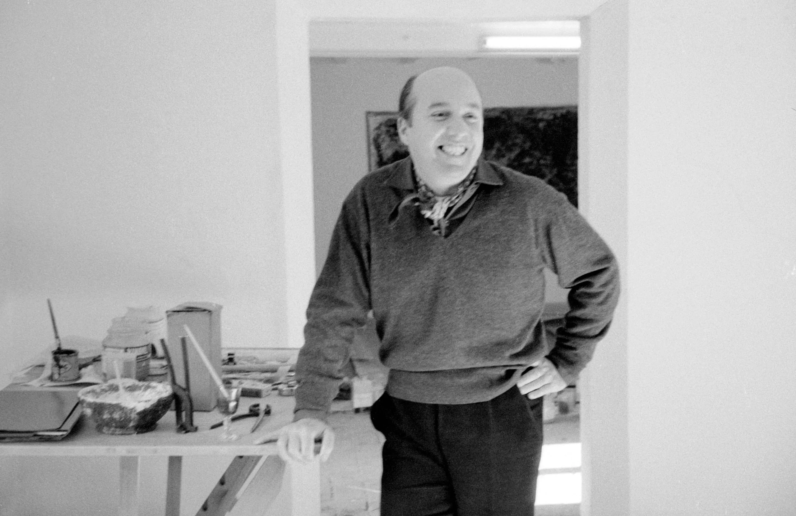 Black and white photograph of a heavyset bald man grinning, standing beside a cluttered worktable in what appears to be an artist's studio