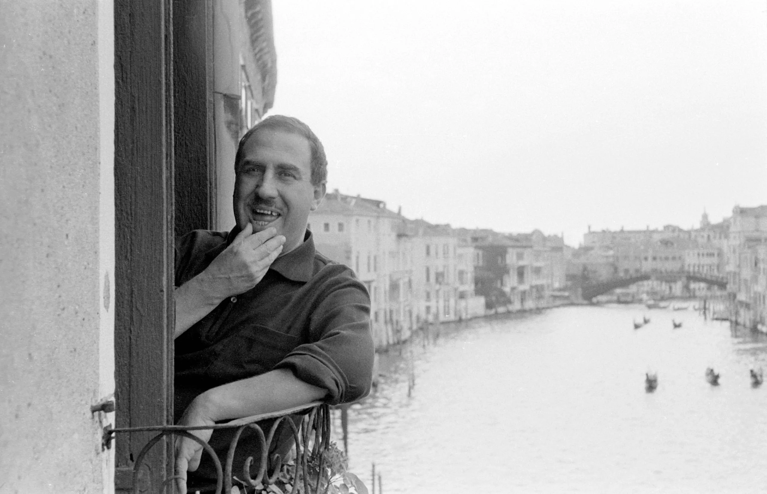 Black and white photograph of a man leaning on a wrought-iron balcony, smiling upward, with a Venetian canal and buildings stretching into the distance behind him