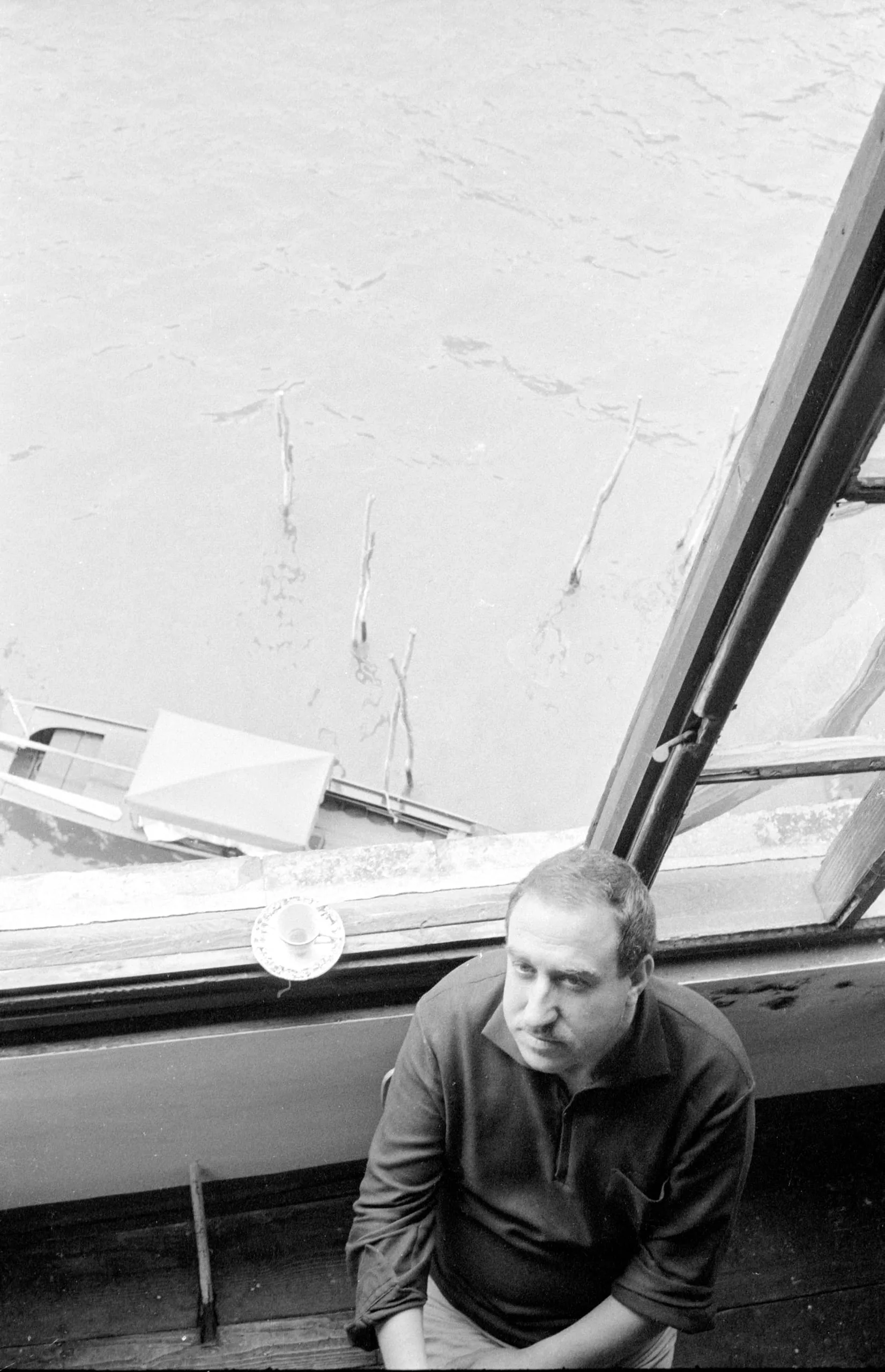 Black and white photograph, shot from above, of a man in a dark polo shirt seated before a large window overlooking a body of water with submerged branches and a partially sunken boat