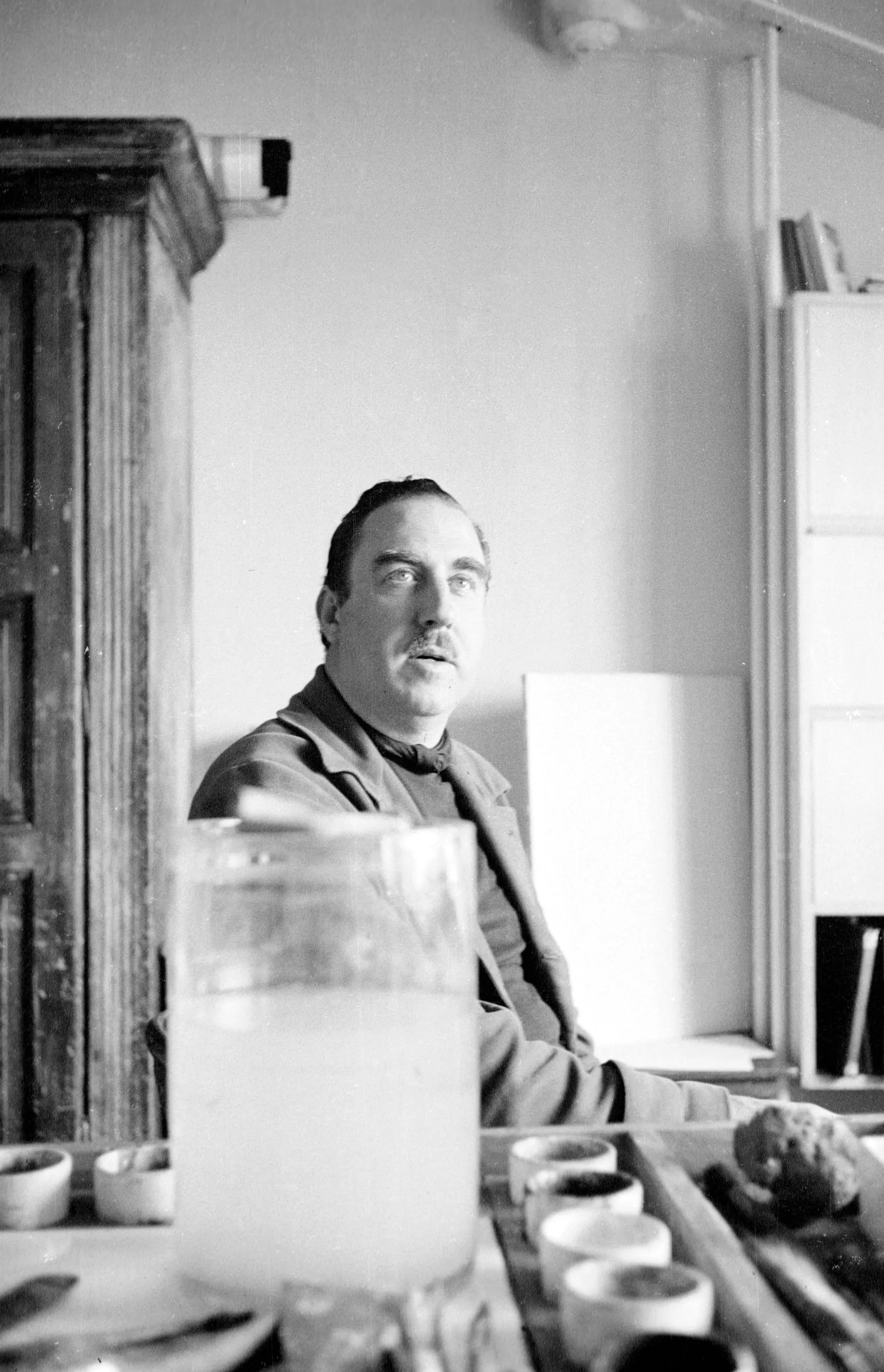Black and white photograph of a man seated at a worktable with small bowls and a glass jar, looking up and to the left, soft diffused lighting
