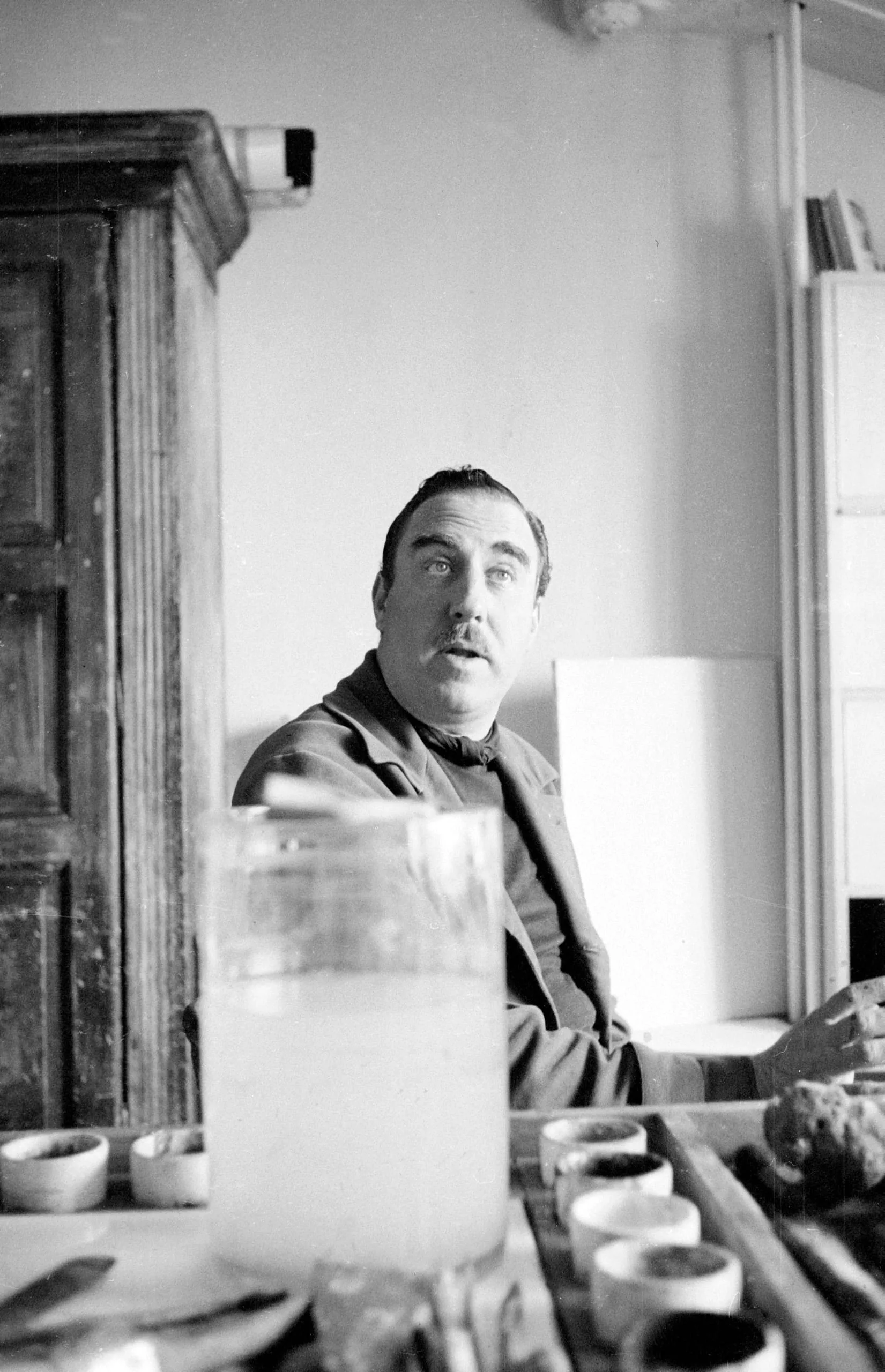Black and white photograph of a man seated at a work table, head tilted back, looking upward, with an out-of-focus glass jar prominent in the foreground