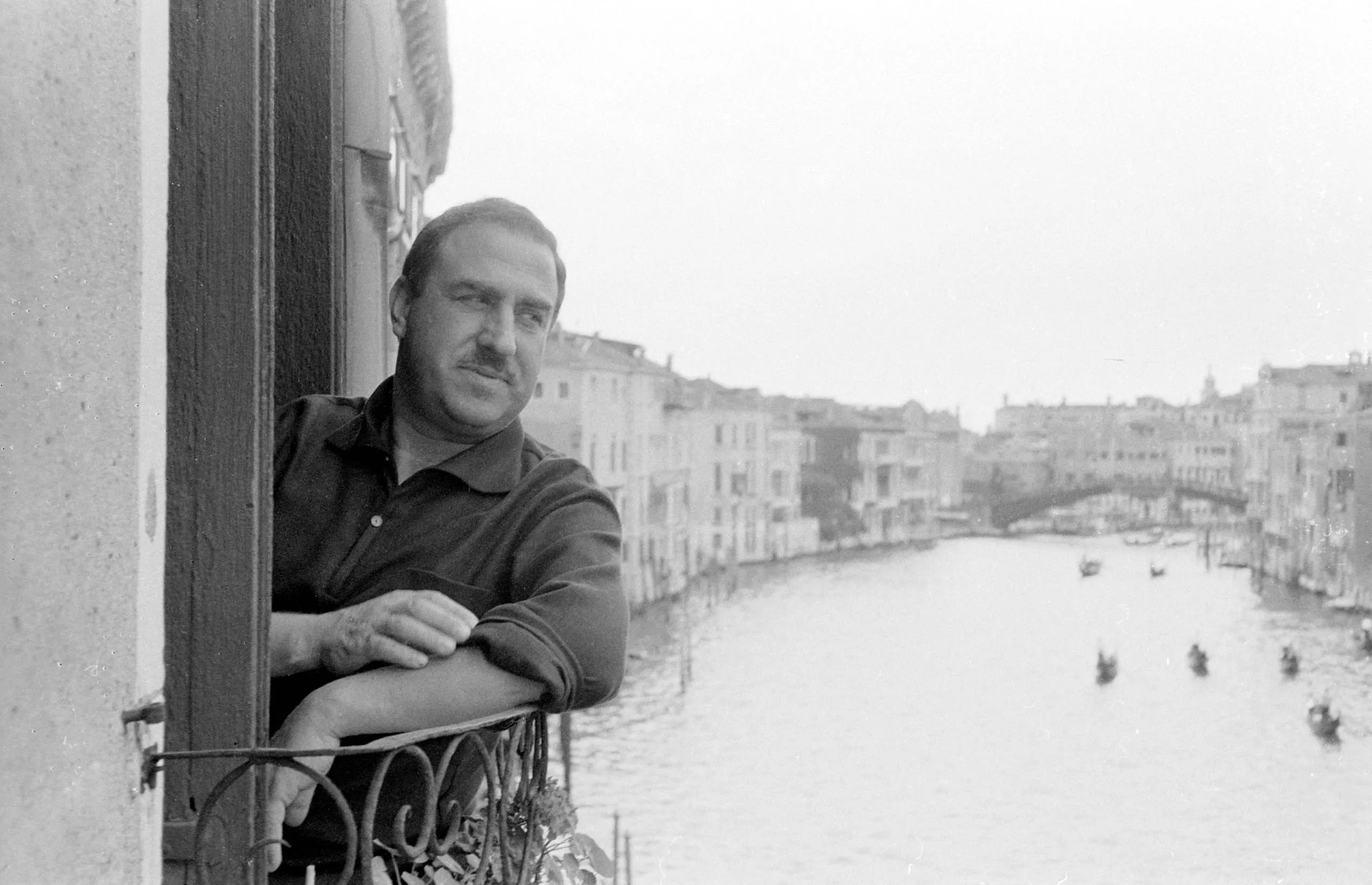 Black and white photograph of a man leaning on a wrought-iron balcony railing, looking at the camera, with a Venetian canal and buildings receding into the distance behind him