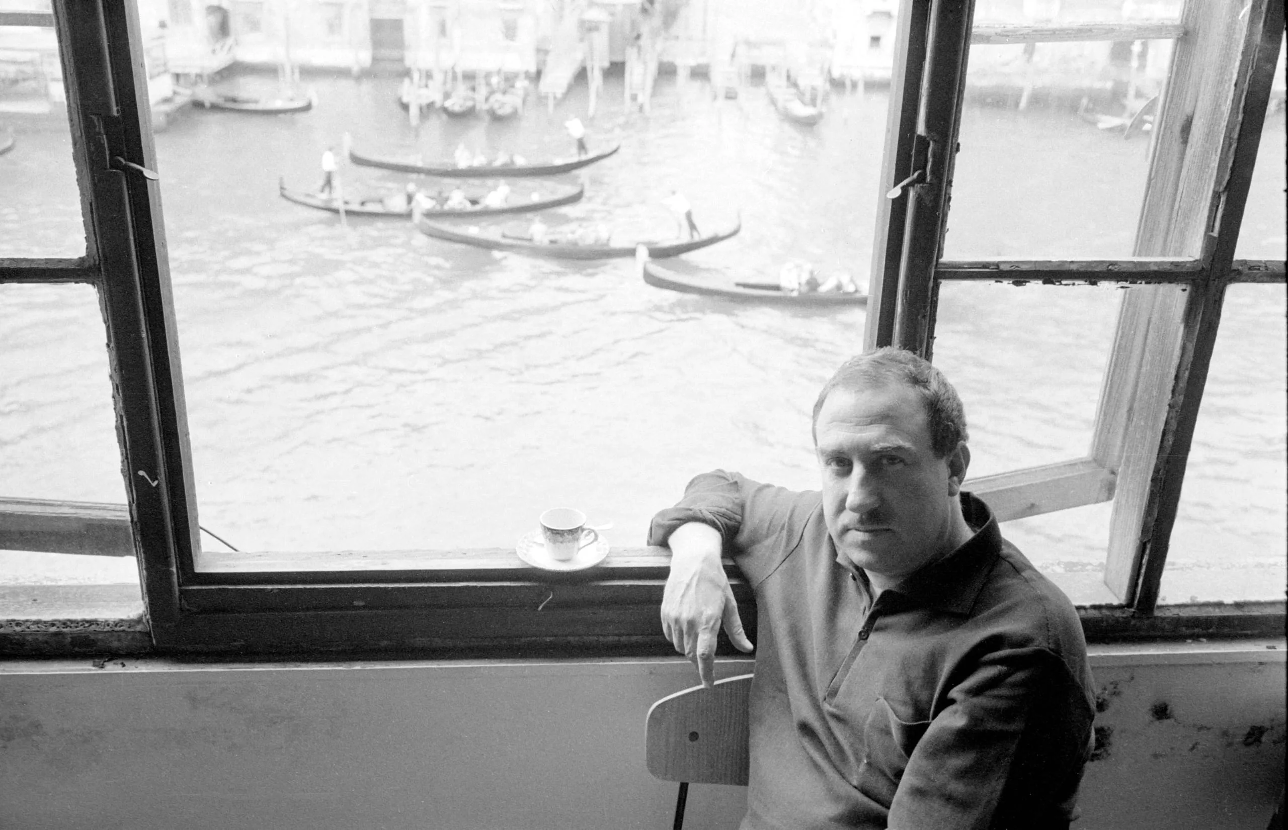 Black and white photograph of a man in a dark polo shirt seated by a multi-pane window overlooking a Venetian canal with gondolas
