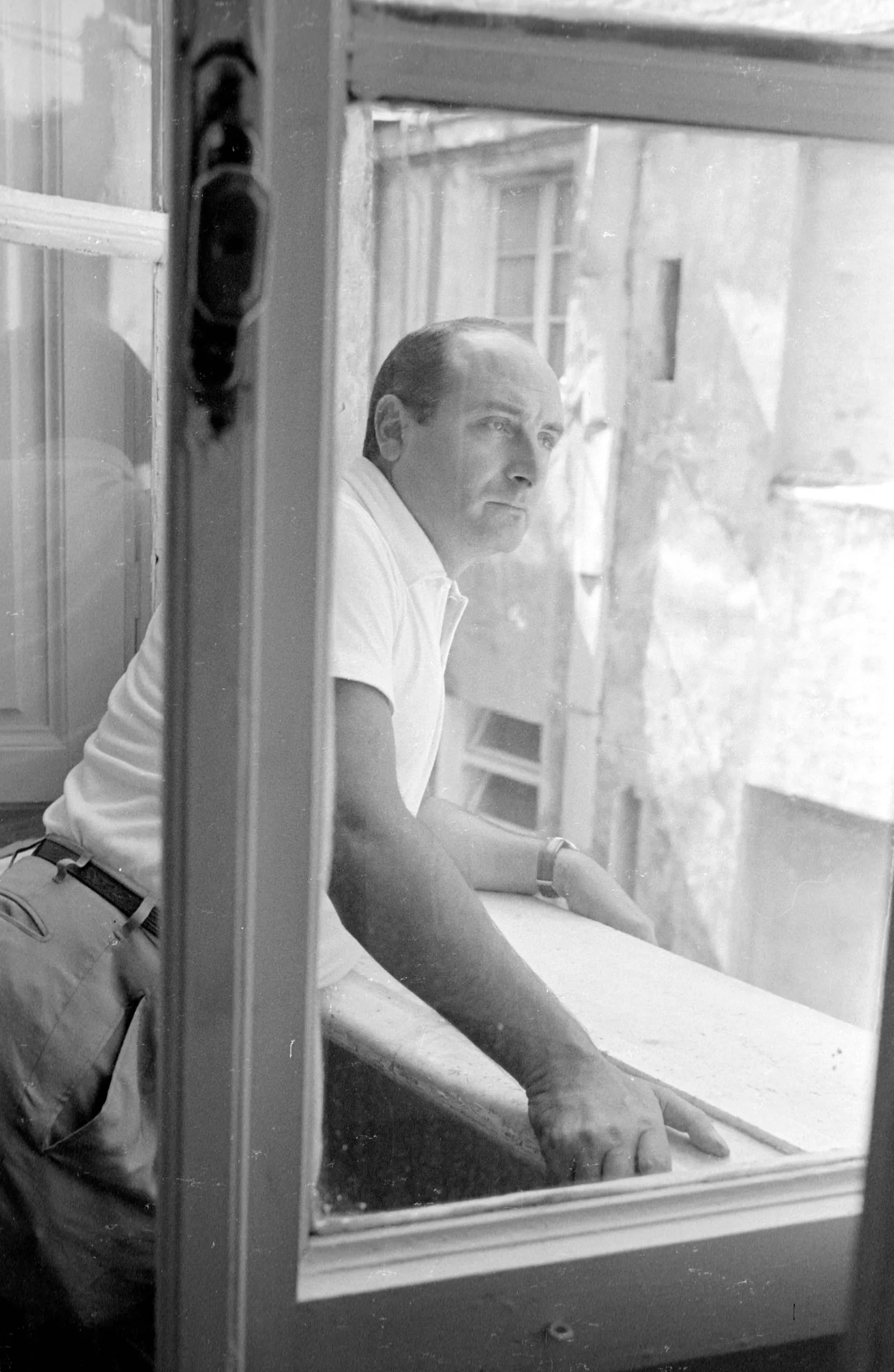 Black and white photograph of a white man in a short-sleeved white shirt leaning on a windowsill, seen through a multi-paned window, looking to the left