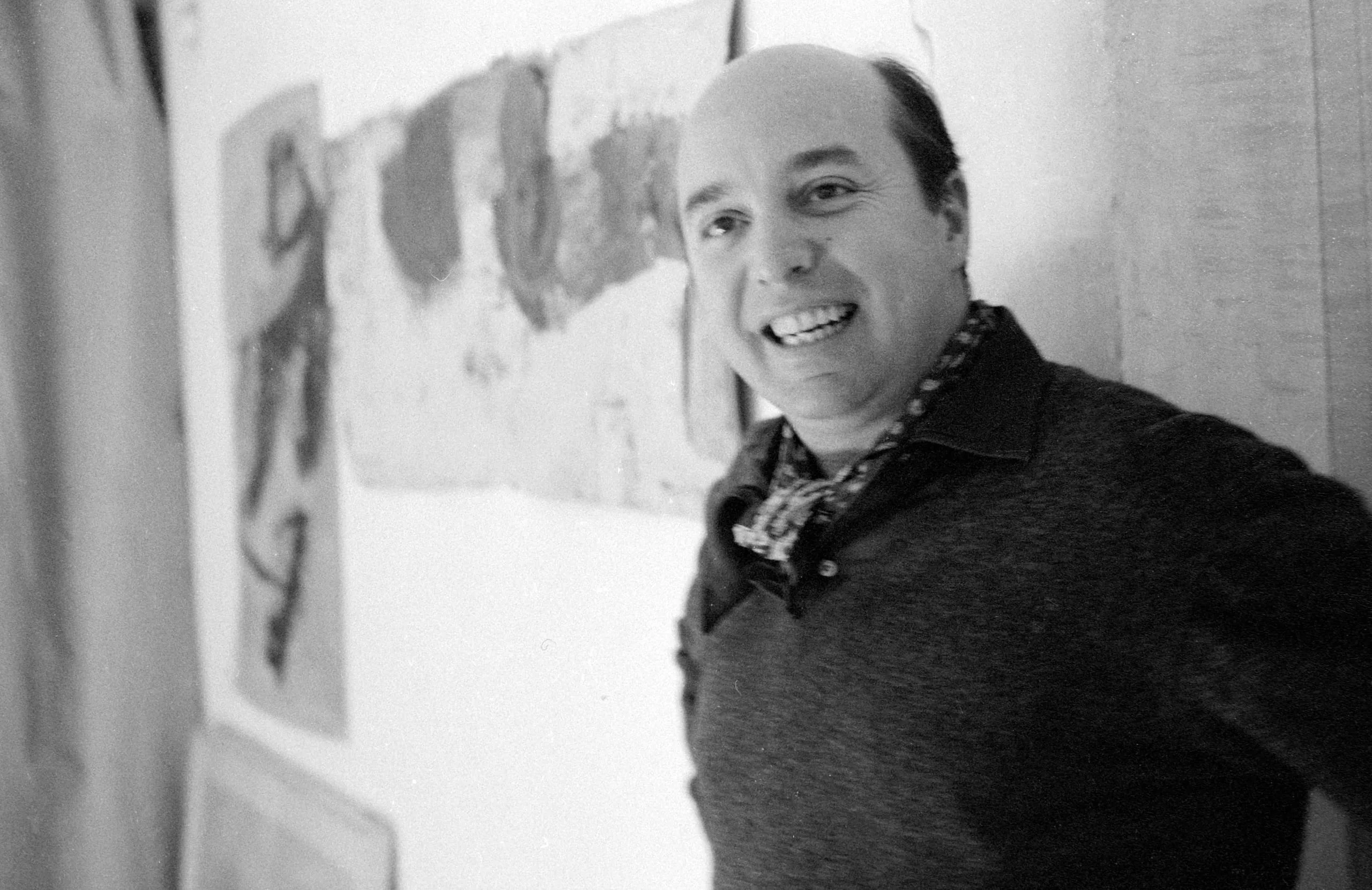 Black and white photograph, chest-up portrait of a smiling heavyset man leaning against a wall, with abstract artworks visible behind him
