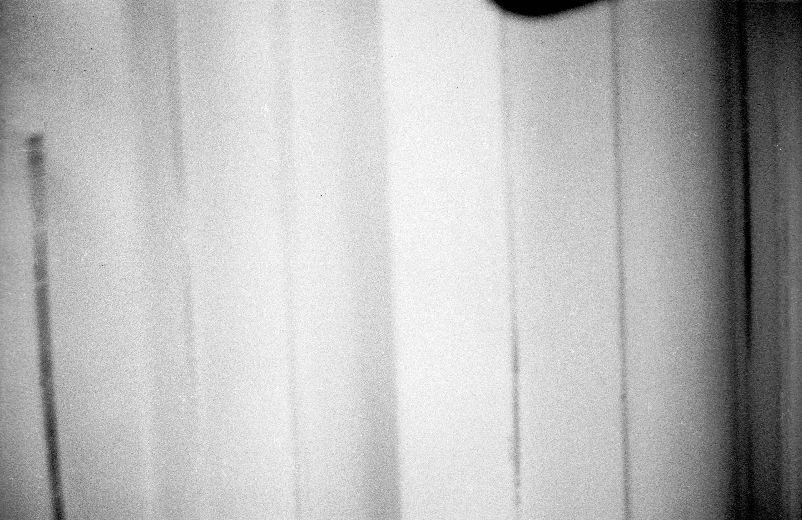 Black and white film photograph, heavily blurred and grainy, showing pale vertical forms with darkened edges and an unidentifiable dark shape at upper right