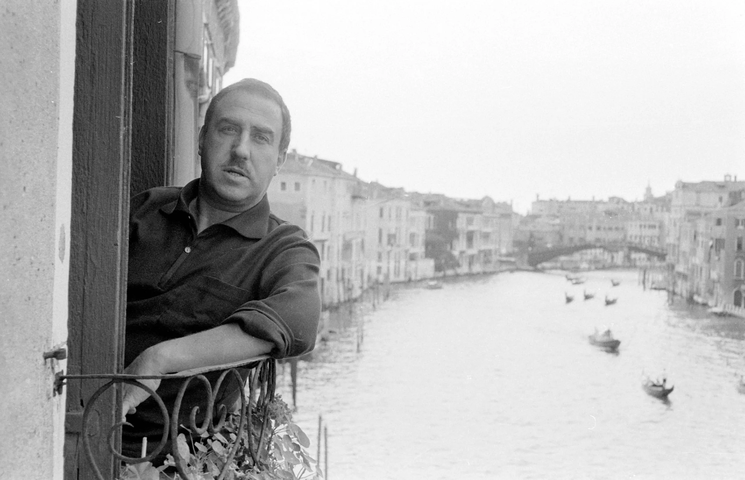 Black and white photograph of a man leaning on a wrought-iron balcony, looking back over his shoulder, with a Venetian canal and buildings receding into the distance behind him