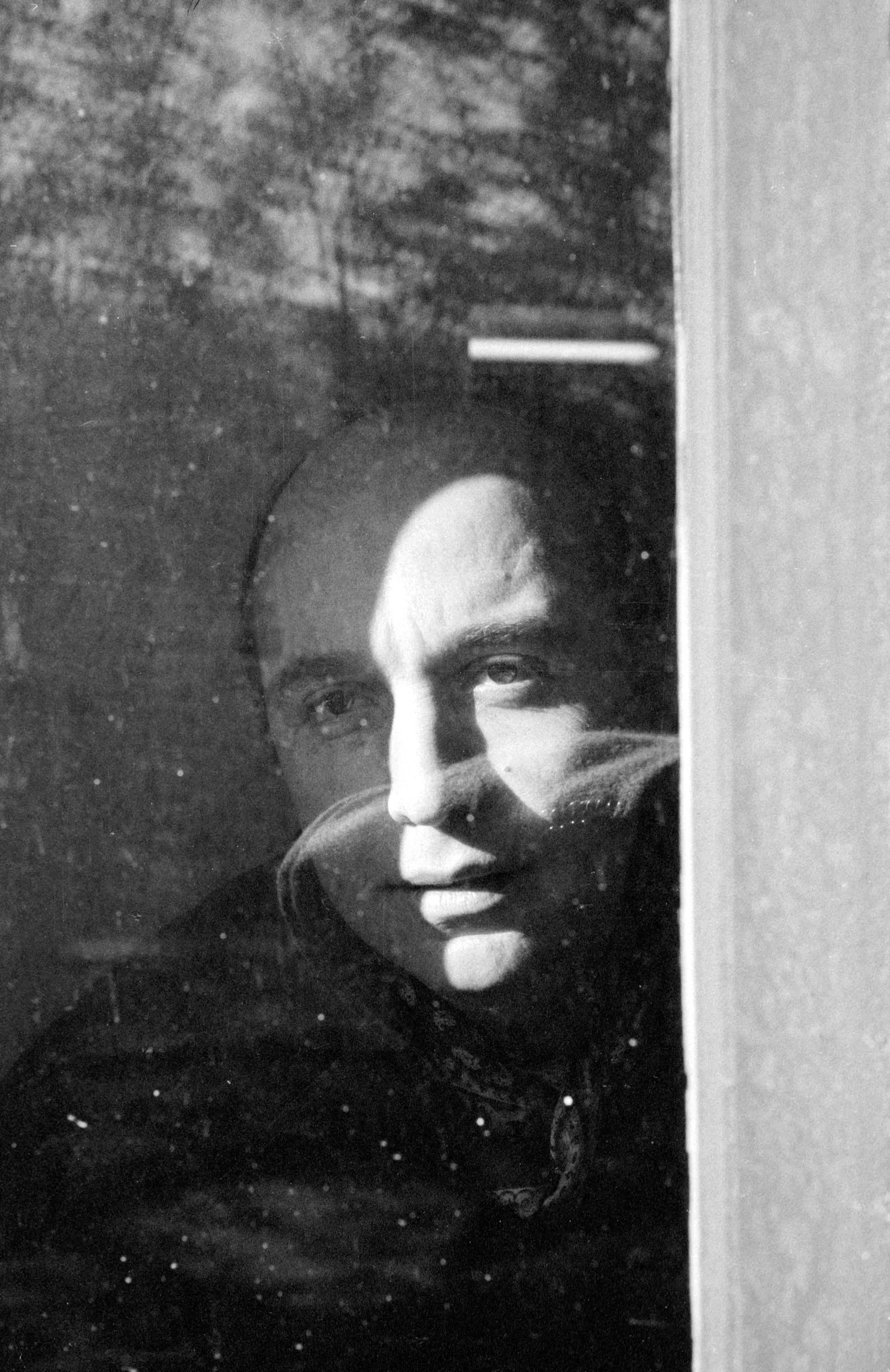 Black and white photograph of a white man's face seen through a dirty, scratched window pane, lit sharply from the upper left with deep shadows across half his face