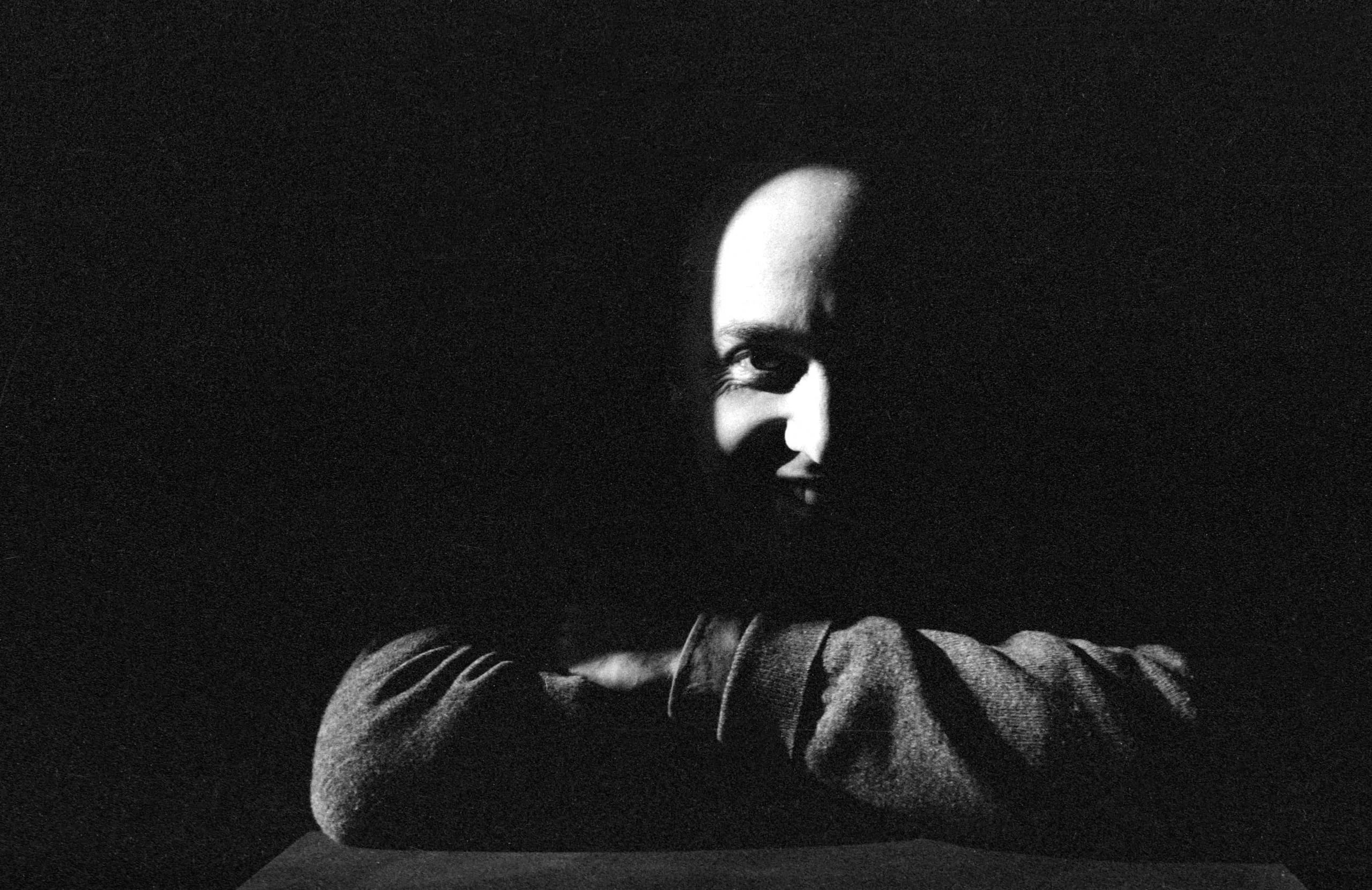 Black and white portrait photograph, Black man with crossed arms resting on a table, lit by strong directional light from upper left against a near-black background