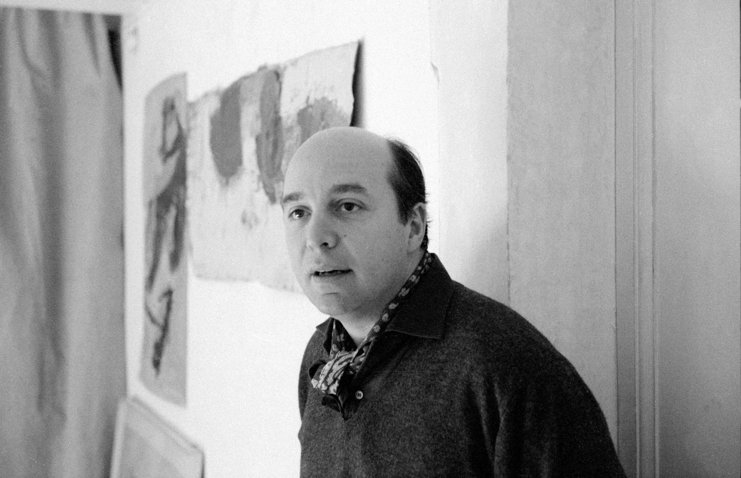 Black and white photograph, chest-up portrait of a white man with a receding hairline, wearing a dark sweater, standing near a white wall with abstract paintings visible behind him
