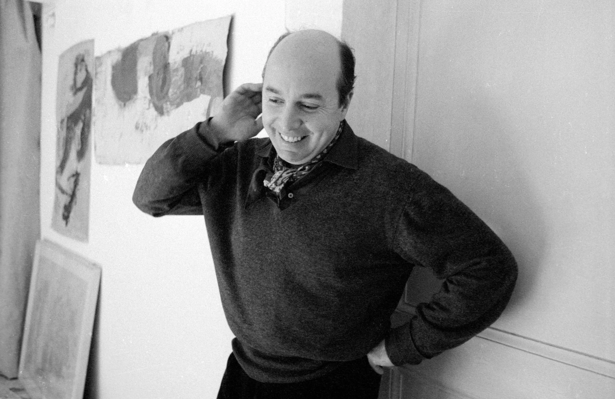 Black and white photograph of a balding man in a dark sweater leaning against a white wall, smiling, with abstract artworks hung behind him