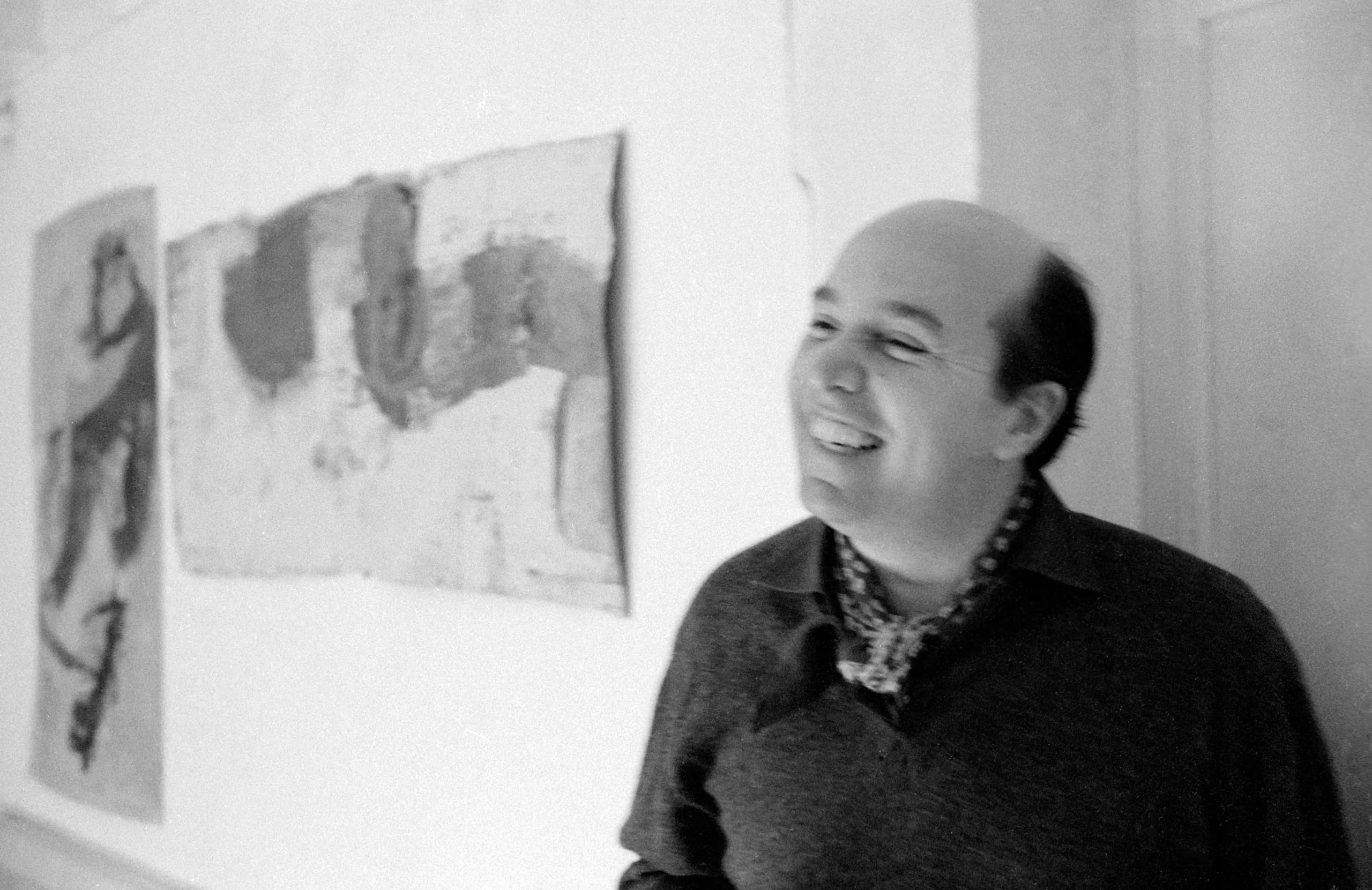 Black and white photograph of a smiling bald man in a dark shirt standing before a white wall hung with two abstract artworks