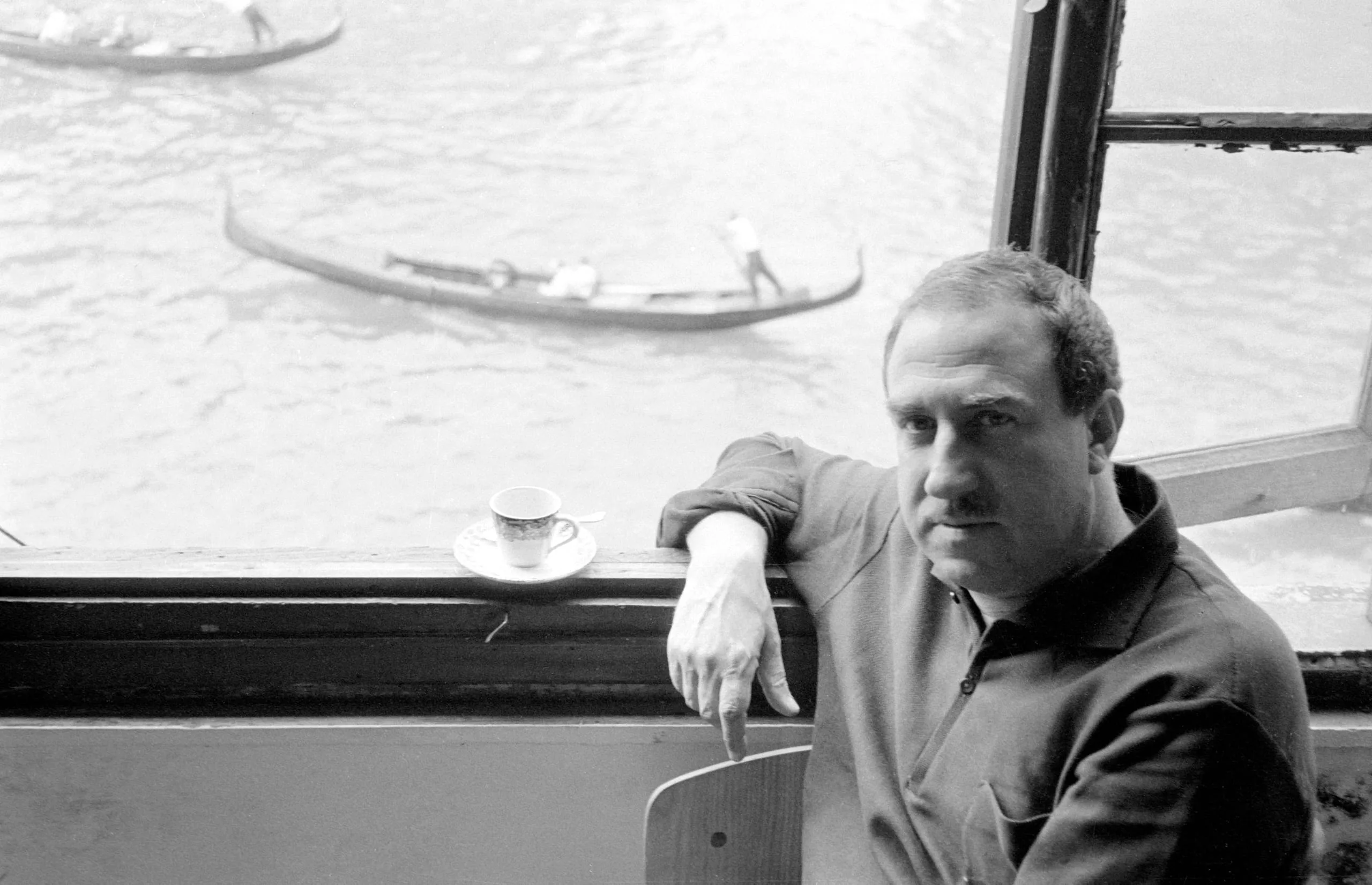 Black and white photograph, man seated at a window ledge with espresso cup, two gondolas visible on a canal behind him