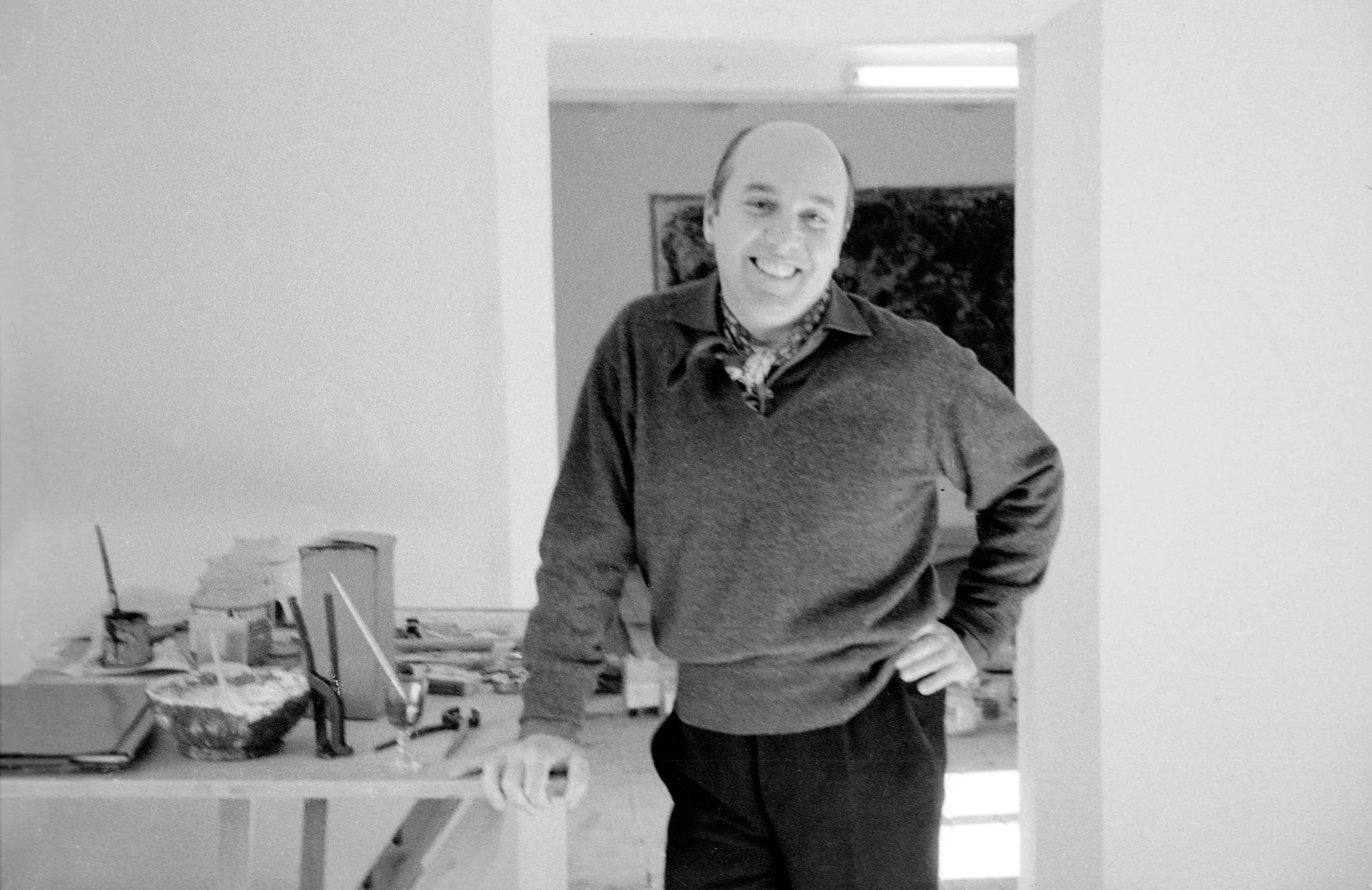 Black and white photograph of a smiling, bald white man standing in an artist's studio, leaning against a worktable scattered with tools