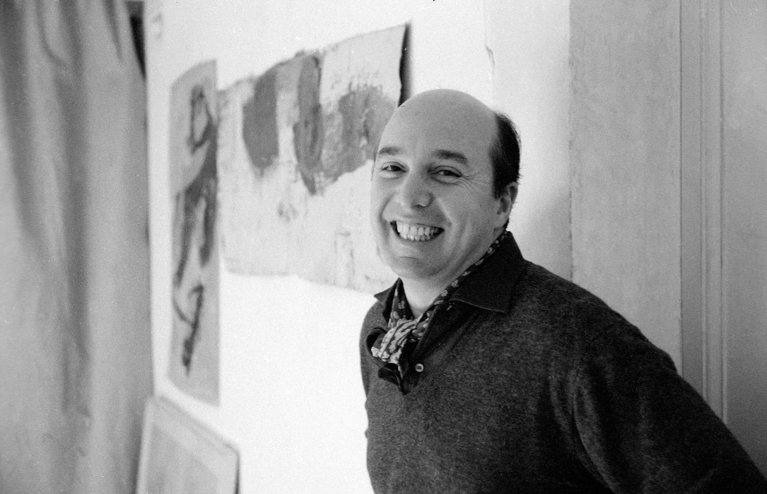 Black and white photograph of a smiling, balding man in a gray sweater leaning against a white wall hung with abstract artworks