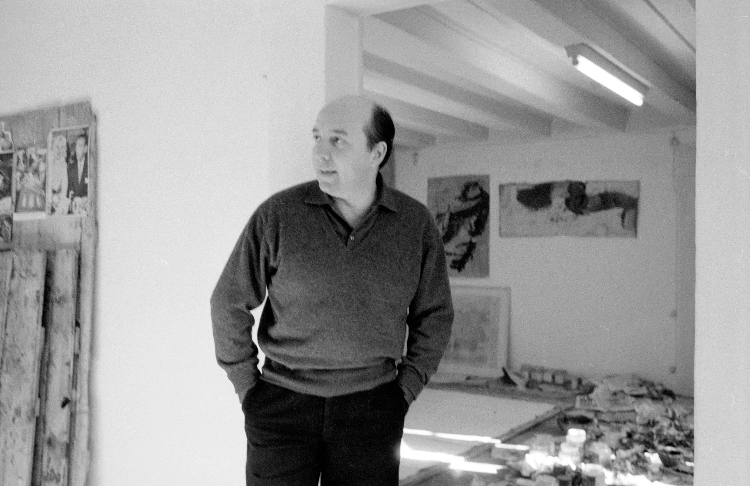Black and white photograph of a bald man in a pullover sweater standing in an art studio, surrounded by canvases, debris, and exposed ceiling beams