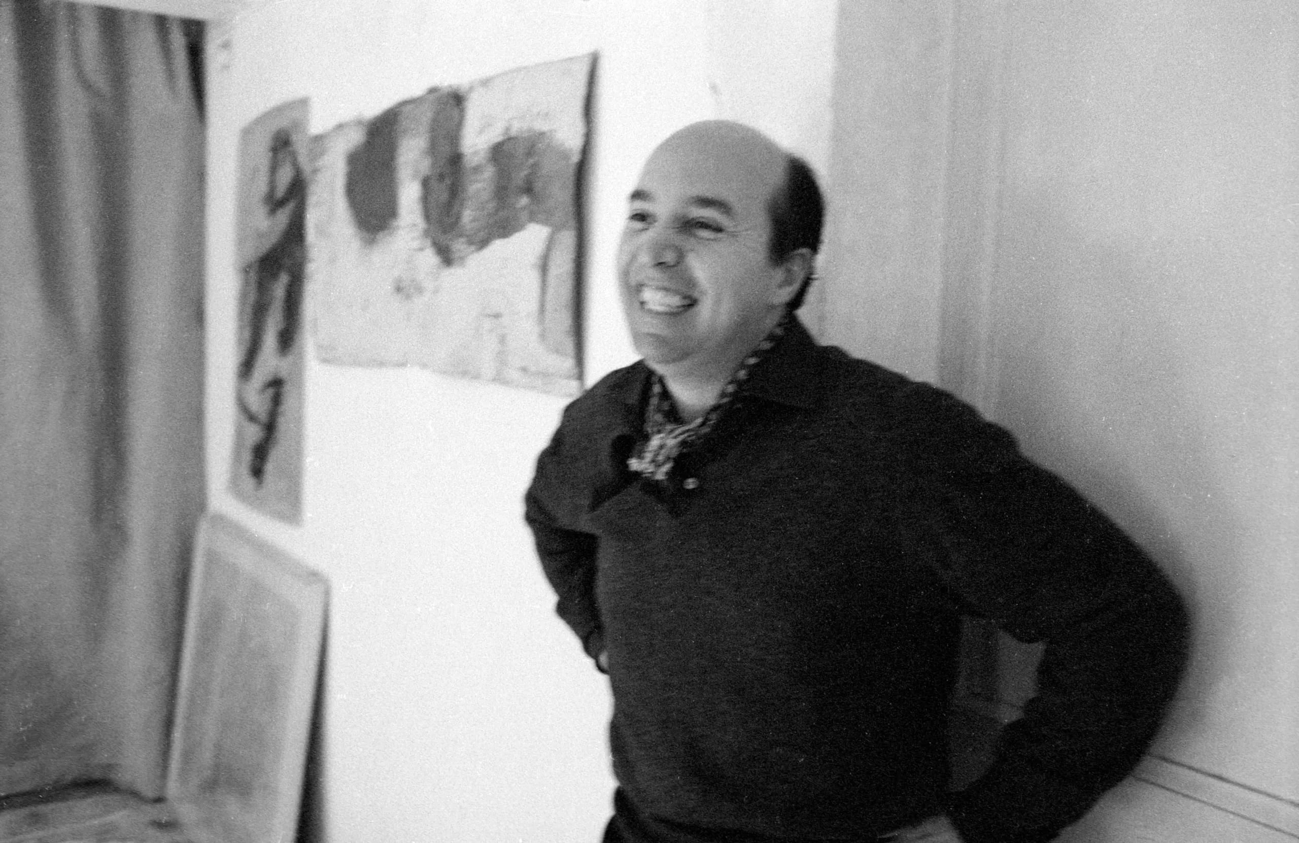 Black and white photograph of a smiling, nearly bald man in a dark sweater standing against a white wall, with abstract artworks visible behind him