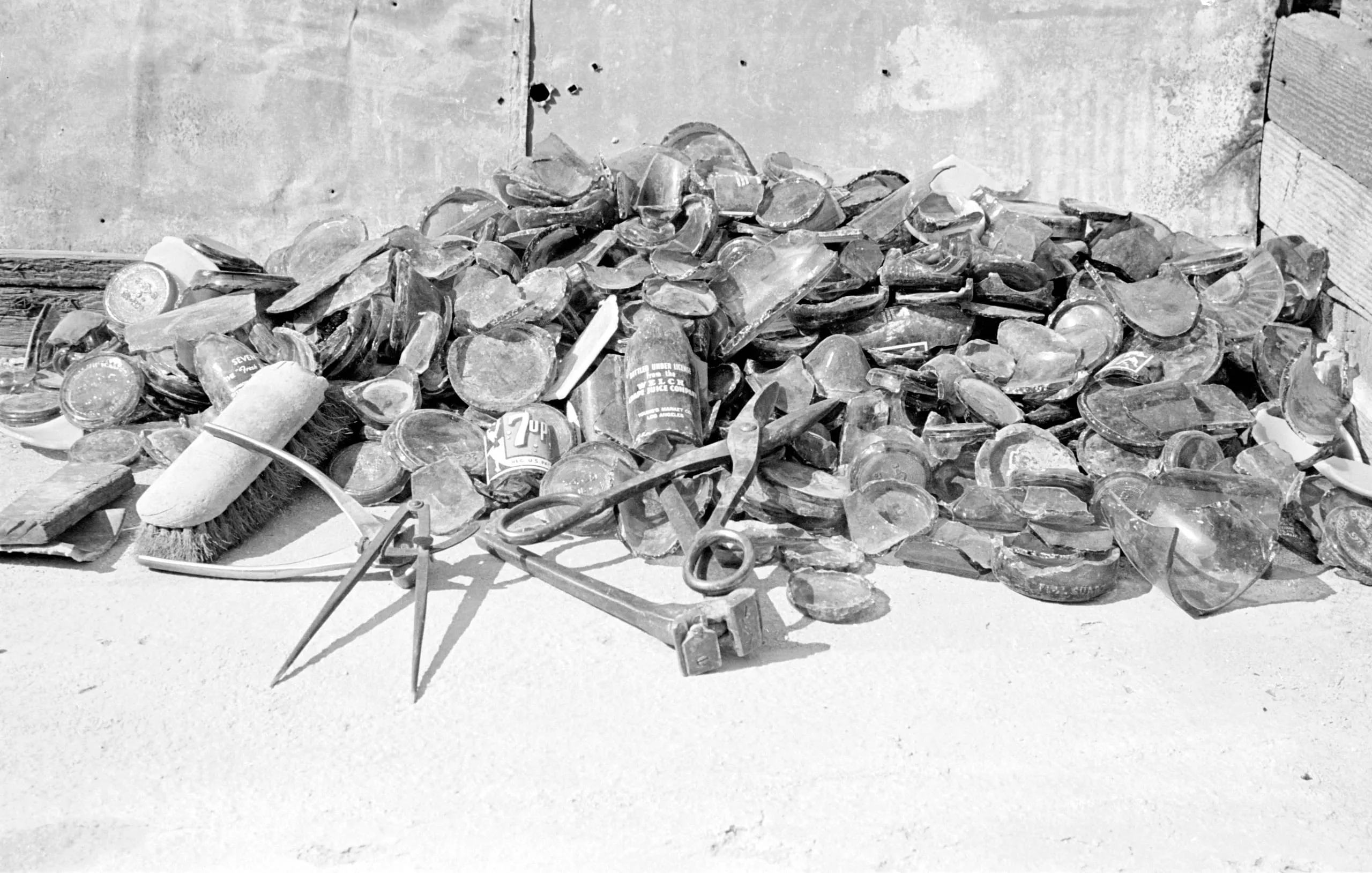 Black and white photograph of a pile of broken glass bottle bottoms heaped against a concrete wall, with scissors, a scrub brush, and a tin can among the debris