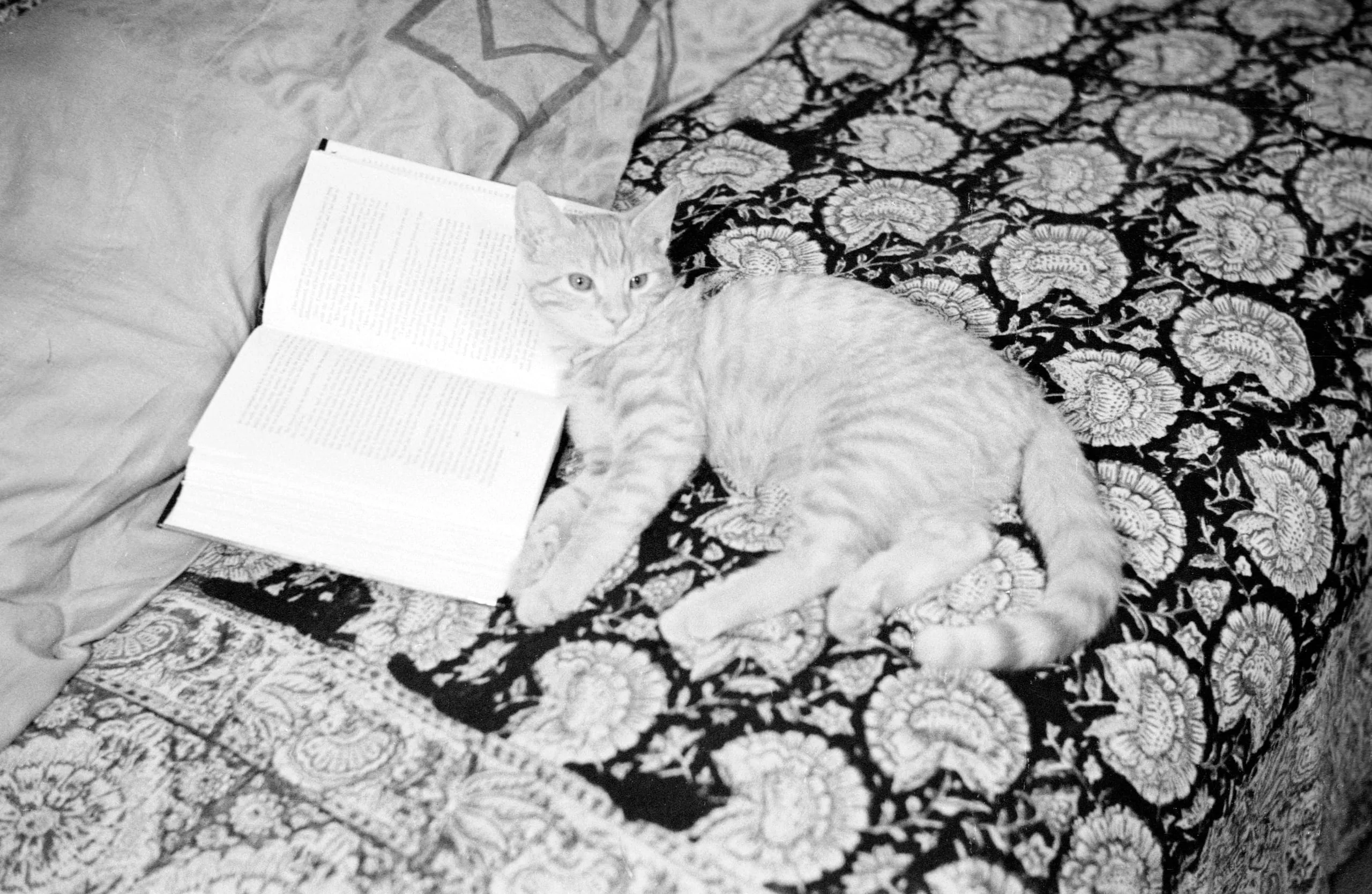 Black and white photograph of a light-colored tabby cat lying on a floral-patterned bedspread next to an open paperback book
