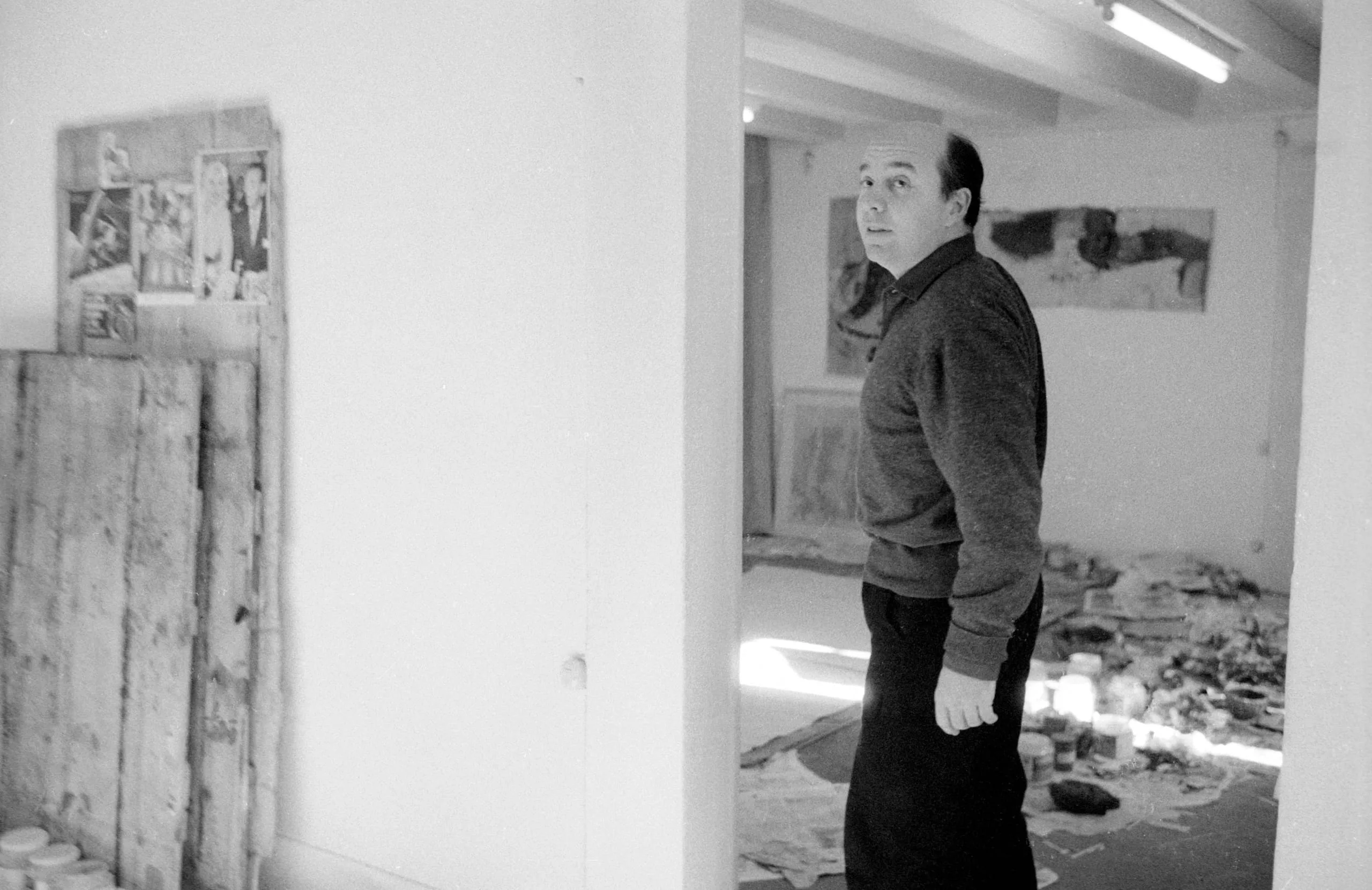 Black and white photograph of a man in a sweater standing in a doorway between two rooms of what appears to be an artist's studio