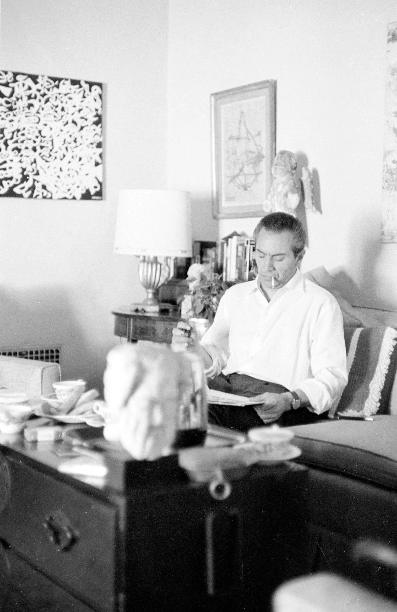 Black and white photograph of a man in a white shirt reading in a chair, cigarette in mouth, surrounded by art-filled walls and a cluttered table in the foreground
