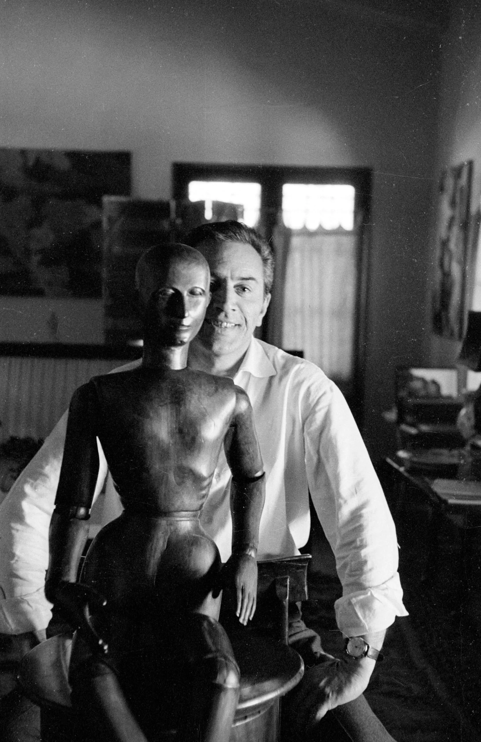 Black and white photograph of a man in a white shirt grinning behind a jointed wooden artist's mannequin in an interior room