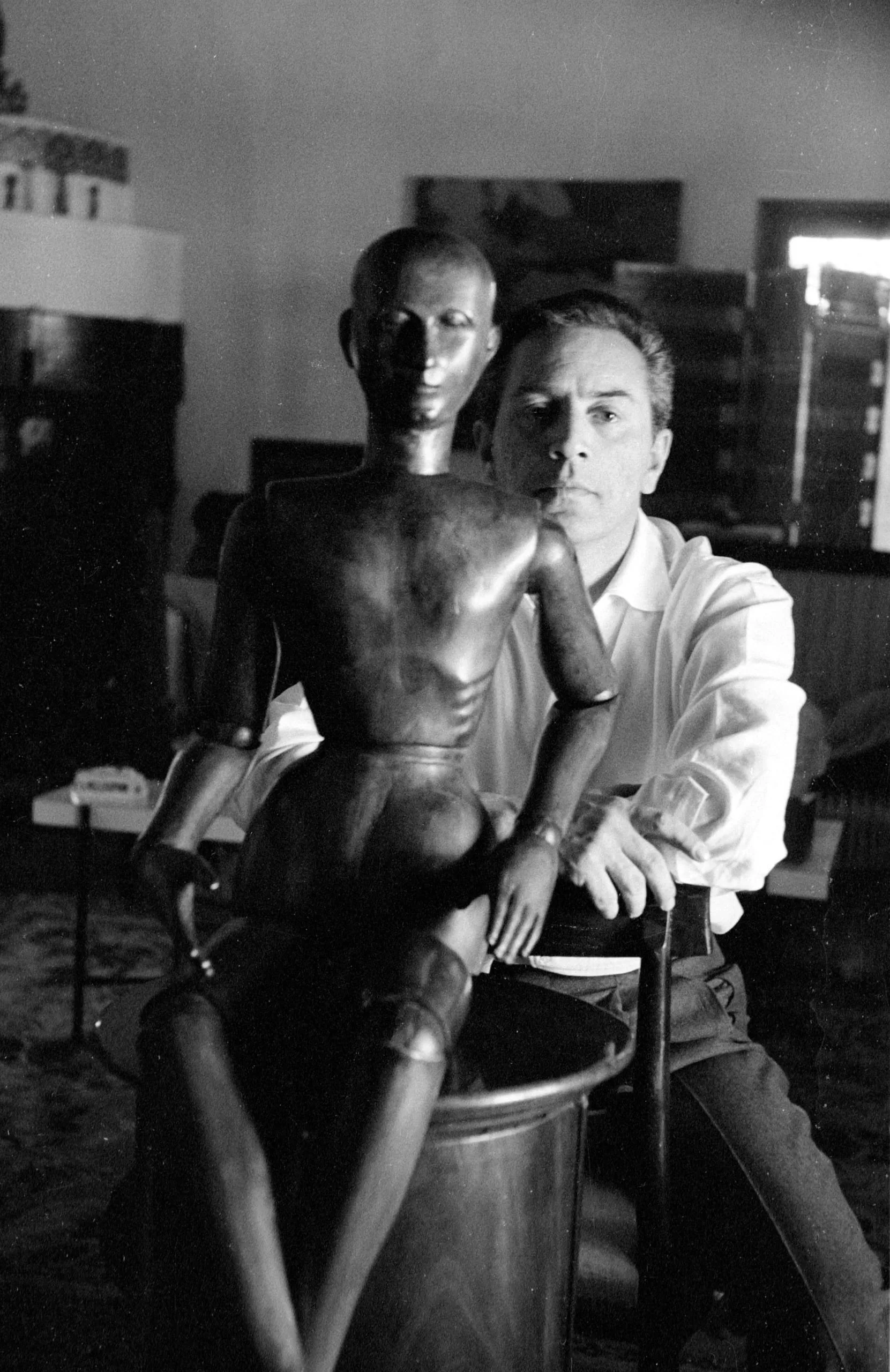 Black and white photograph of a man in a white shirt resting his arm on a large wooden artist's mannequin in a dimly lit studio