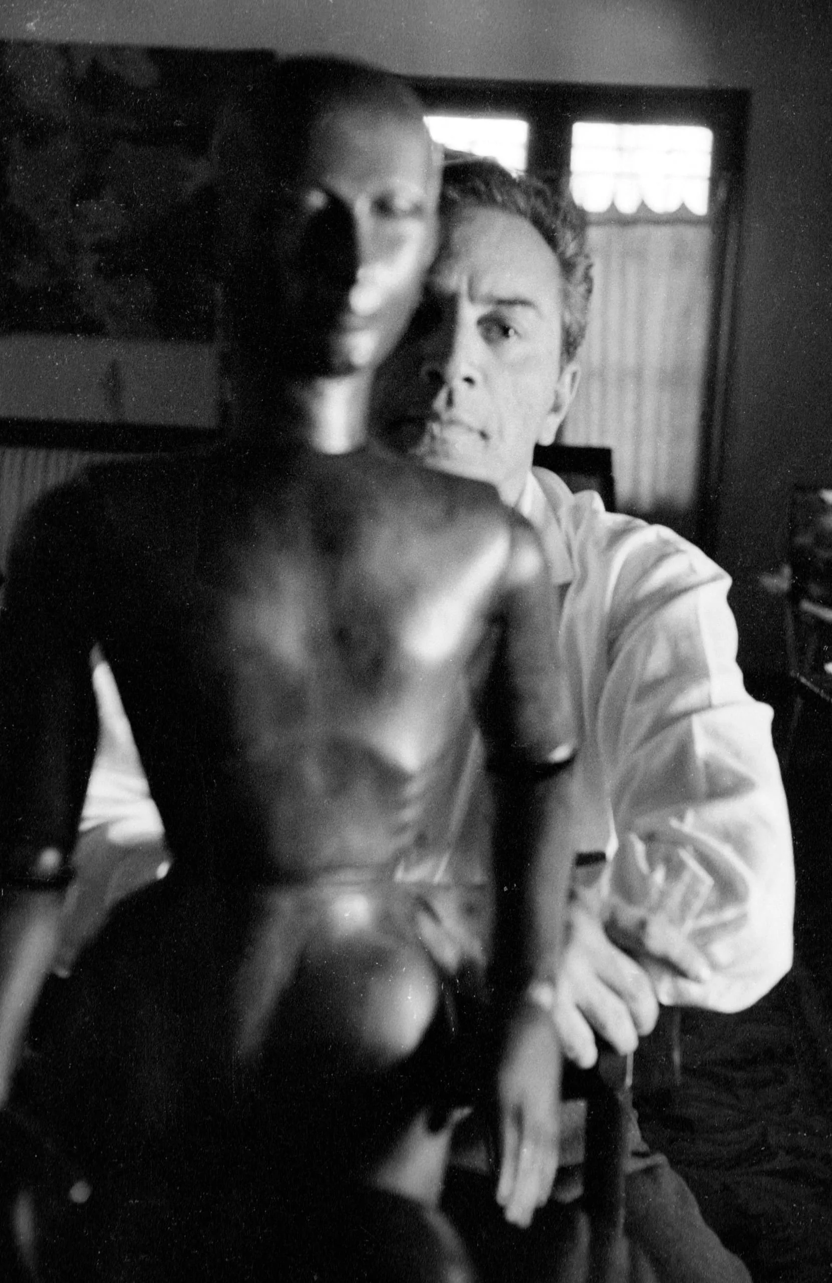 Black and white photograph, a white man in a white shirt stands behind a small, reflective bronze male figure sculpture in a dimly lit interior