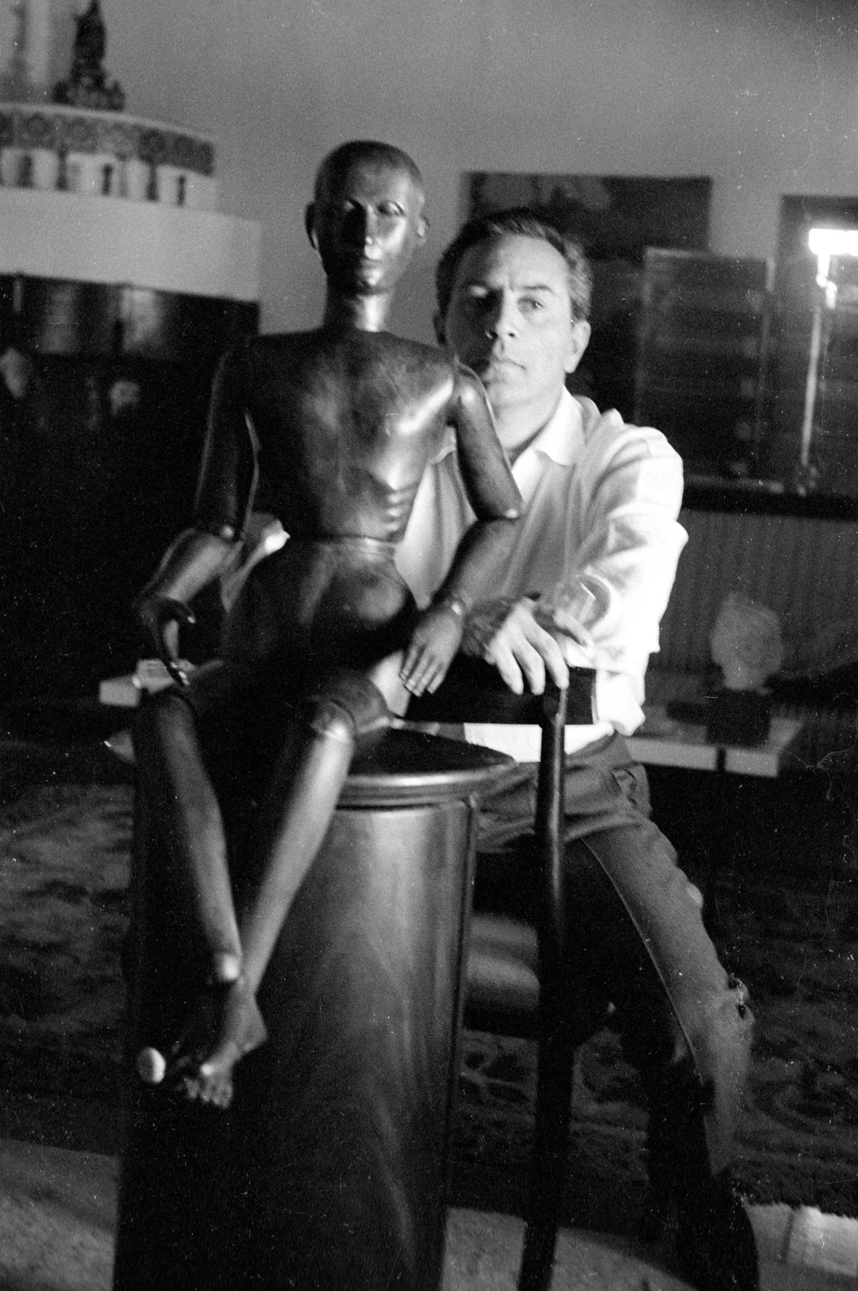 Black and white photograph of a man in a white shirt seated beside a dark pedestal supporting a jointed bronze-toned mannequin sculpture in an interior room