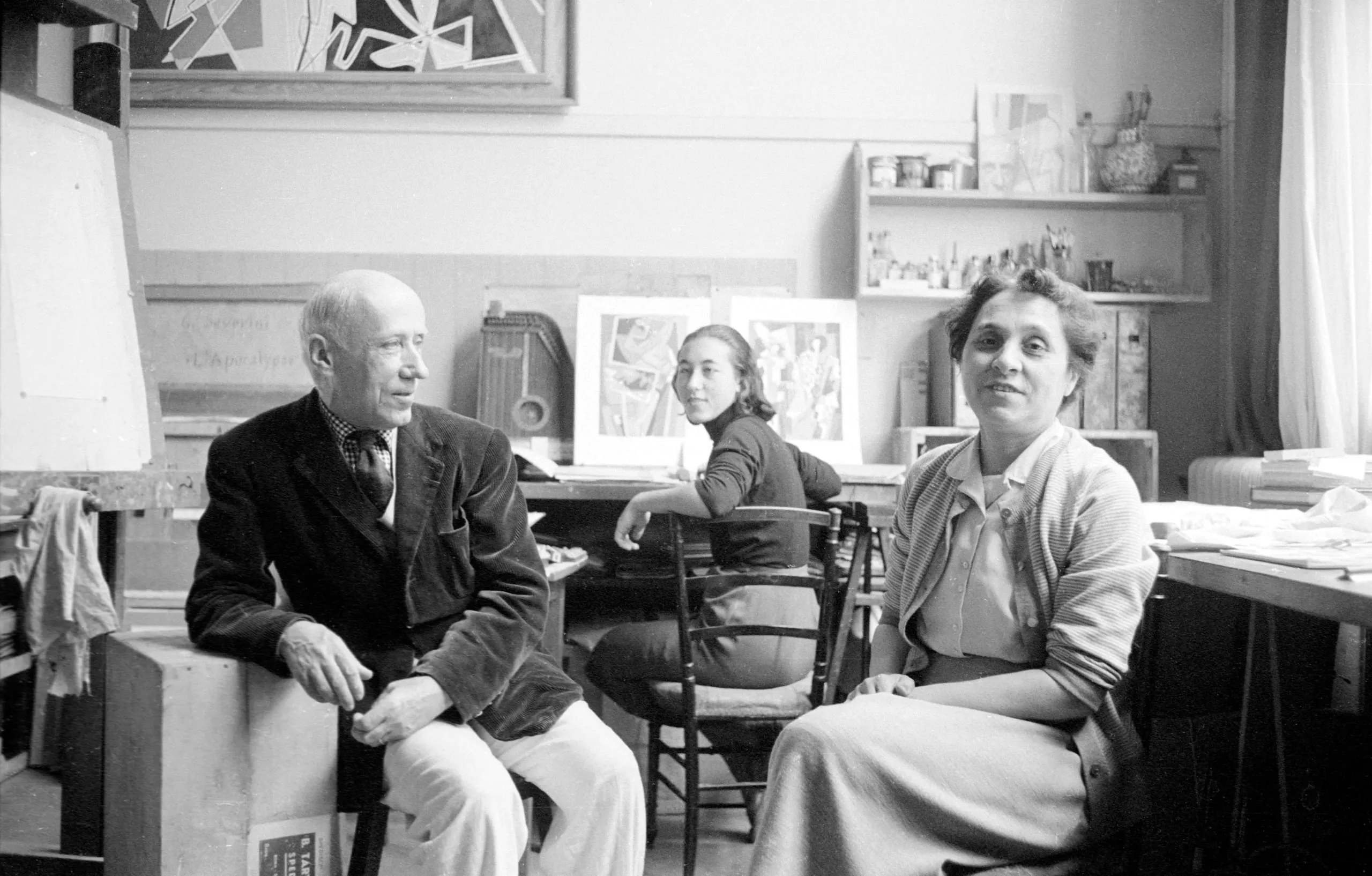 Black and white photograph of three people in an artist's studio, with shelves of art supplies and framed works visible behind them