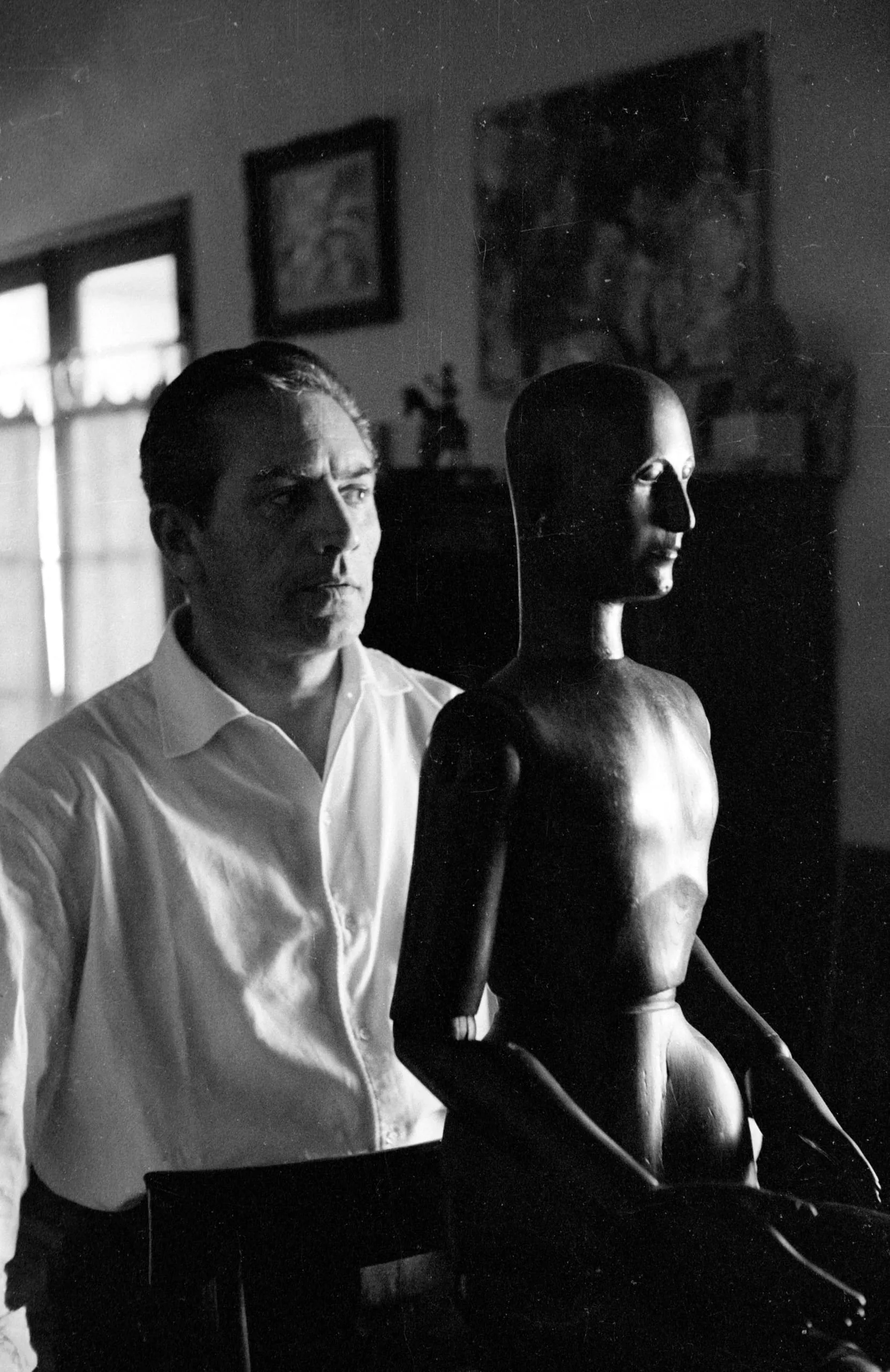 Black and white photograph of a man in a white shirt standing in profile beside an articulated wooden artist's mannequin, both lit from the left with deep shadows