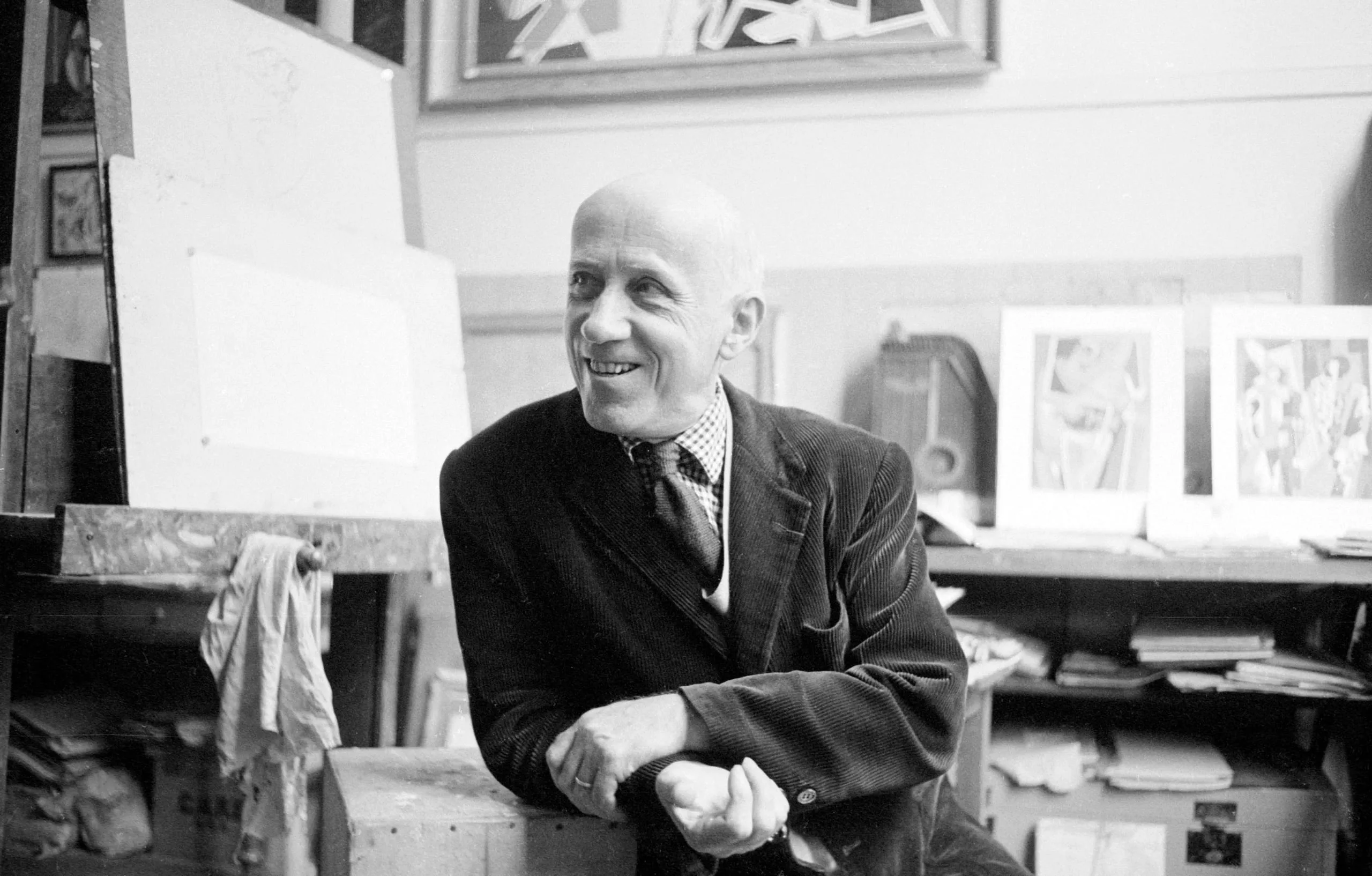 Black and white photograph of a bald, pale-skinned man in a dark blazer leaning on a crate in a cluttered studio, smiling to his left