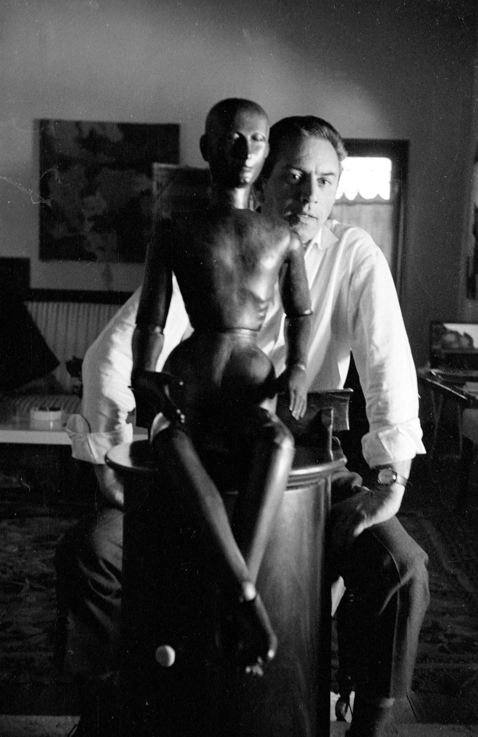 Black and white photograph of a white man in a white shirt seated behind a dark jointed wooden artist's mannequin in a dimly lit interior