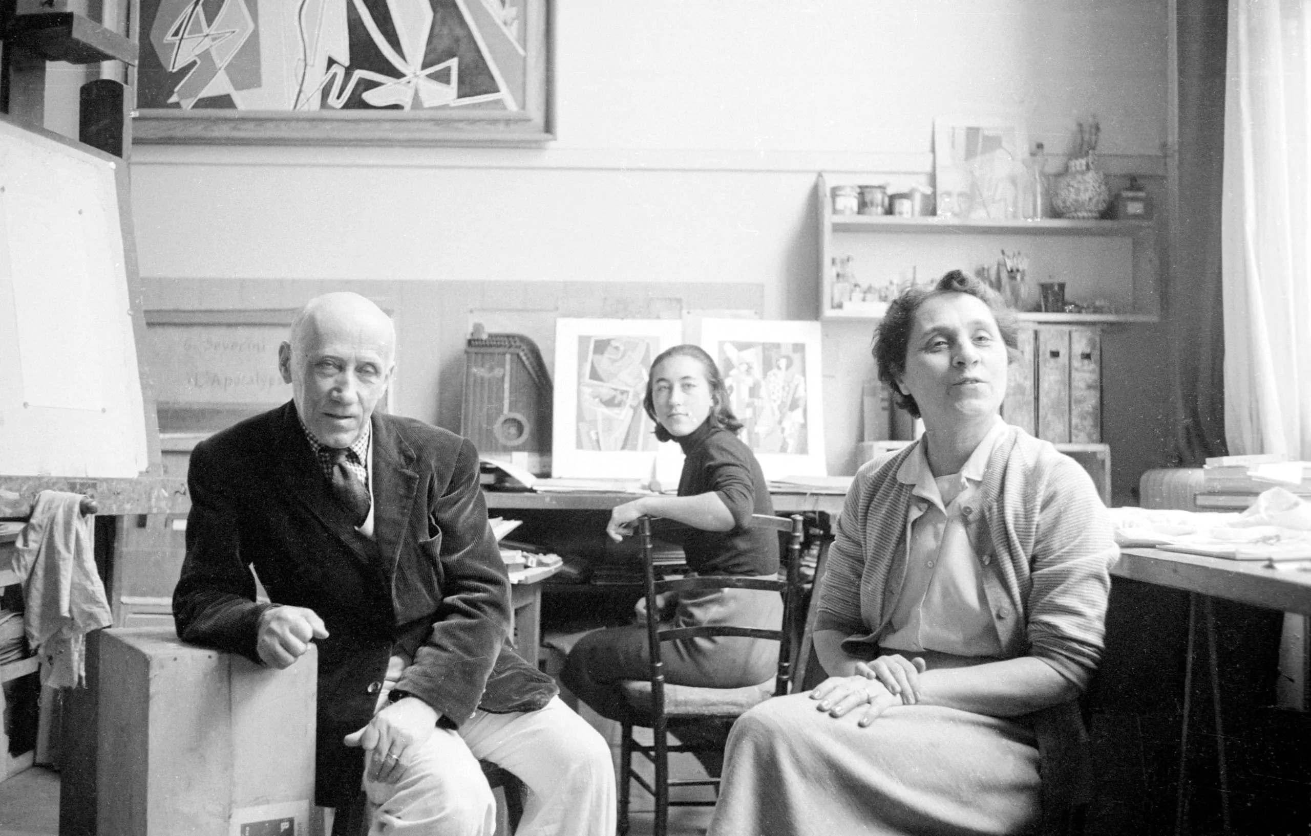 Black and white photograph of three people seated in an artist's studio, with paintings and art supplies visible in the background