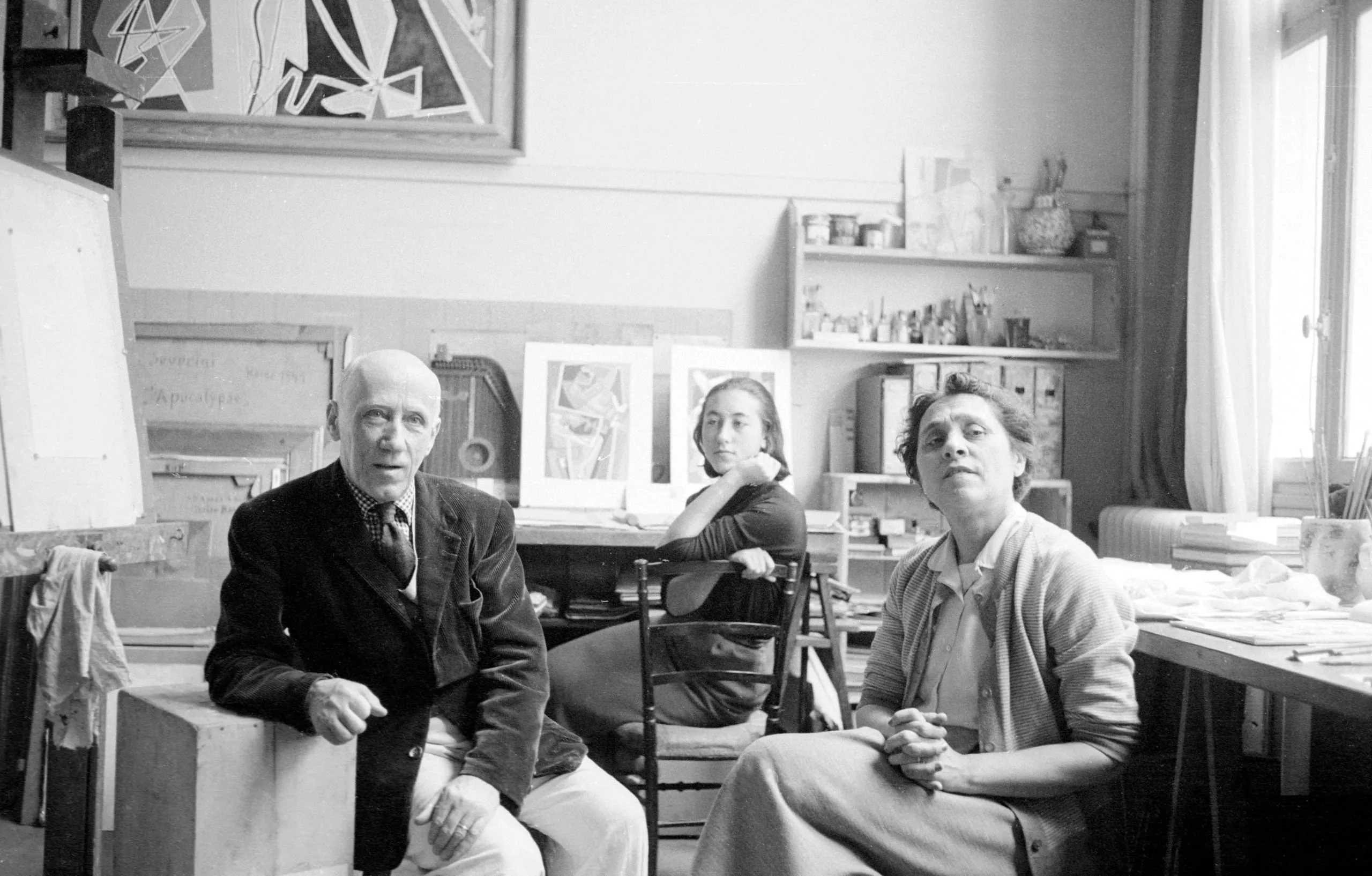 Black and white photograph of three people seated in an artist's studio, with framed works, supply shelves, and a large abstract painting visible behind them