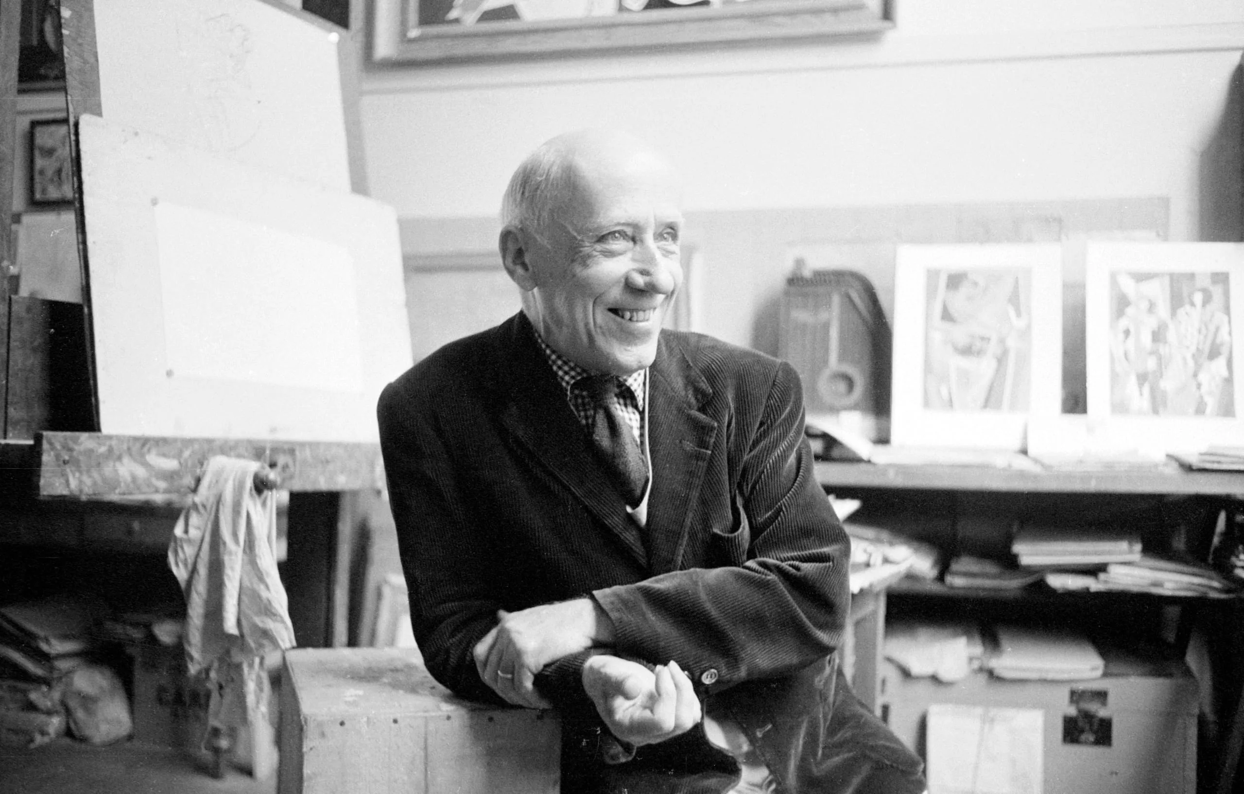 Black and white photograph of an elderly man in a blazer and tie, seated in an artist's studio, smiling and looking to the left