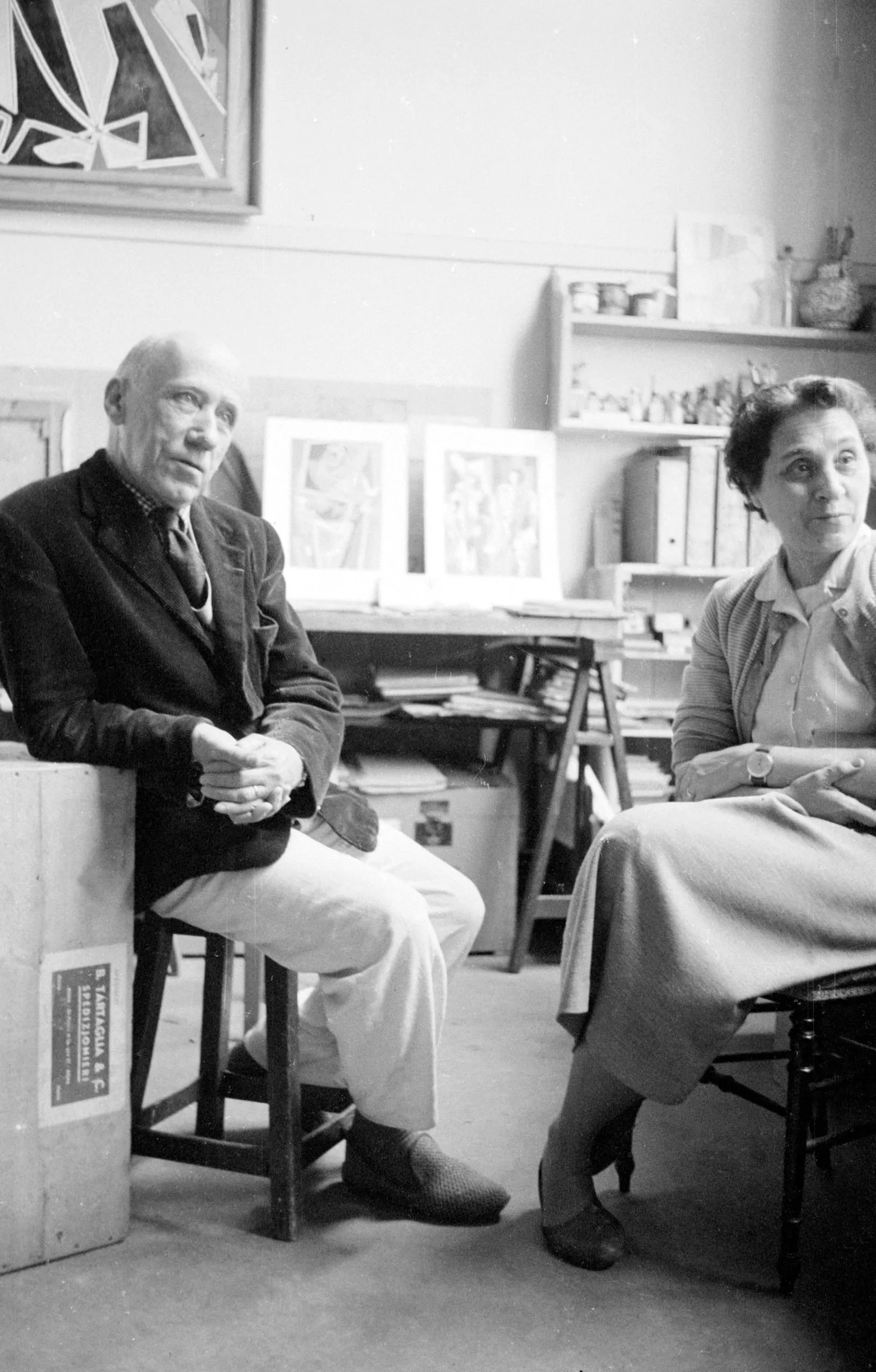 Black and white photograph of an older bald man and a younger dark-haired woman seated in an artist's studio, artworks and shelves visible behind them